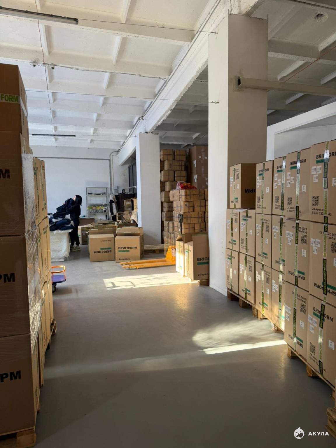 Склад располагается на 1 этаже, высота потолков 6 м, бетонный пол, сетка колонн: 08x08, одна мокрая точка. Внутри типовой ремонт, вход в помещение - отдельный с улицы, общая площадь здания 5500 м2, здание полностью функционирует.