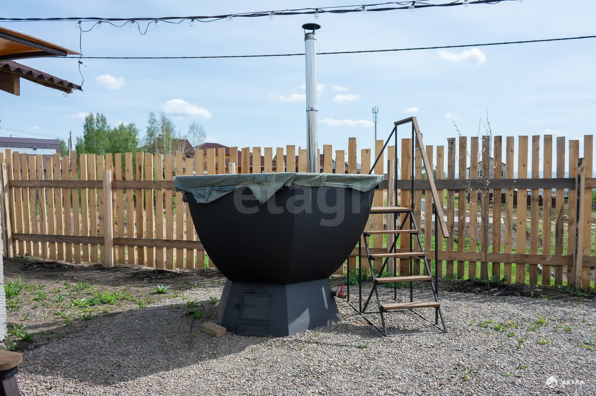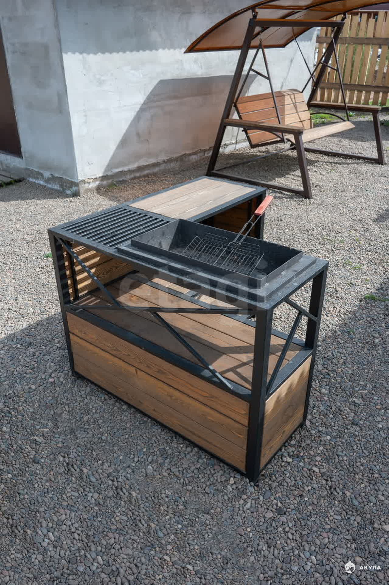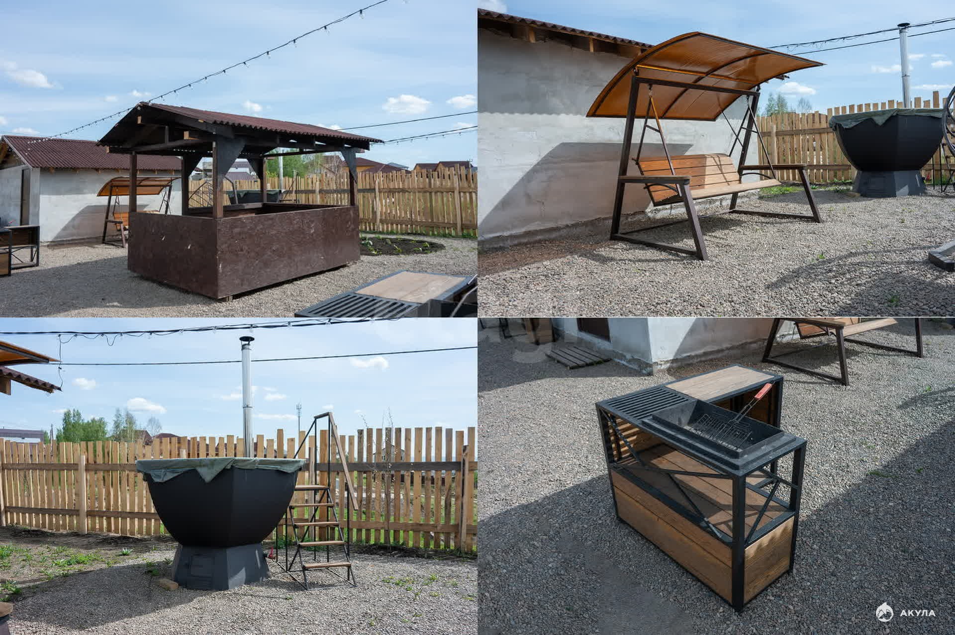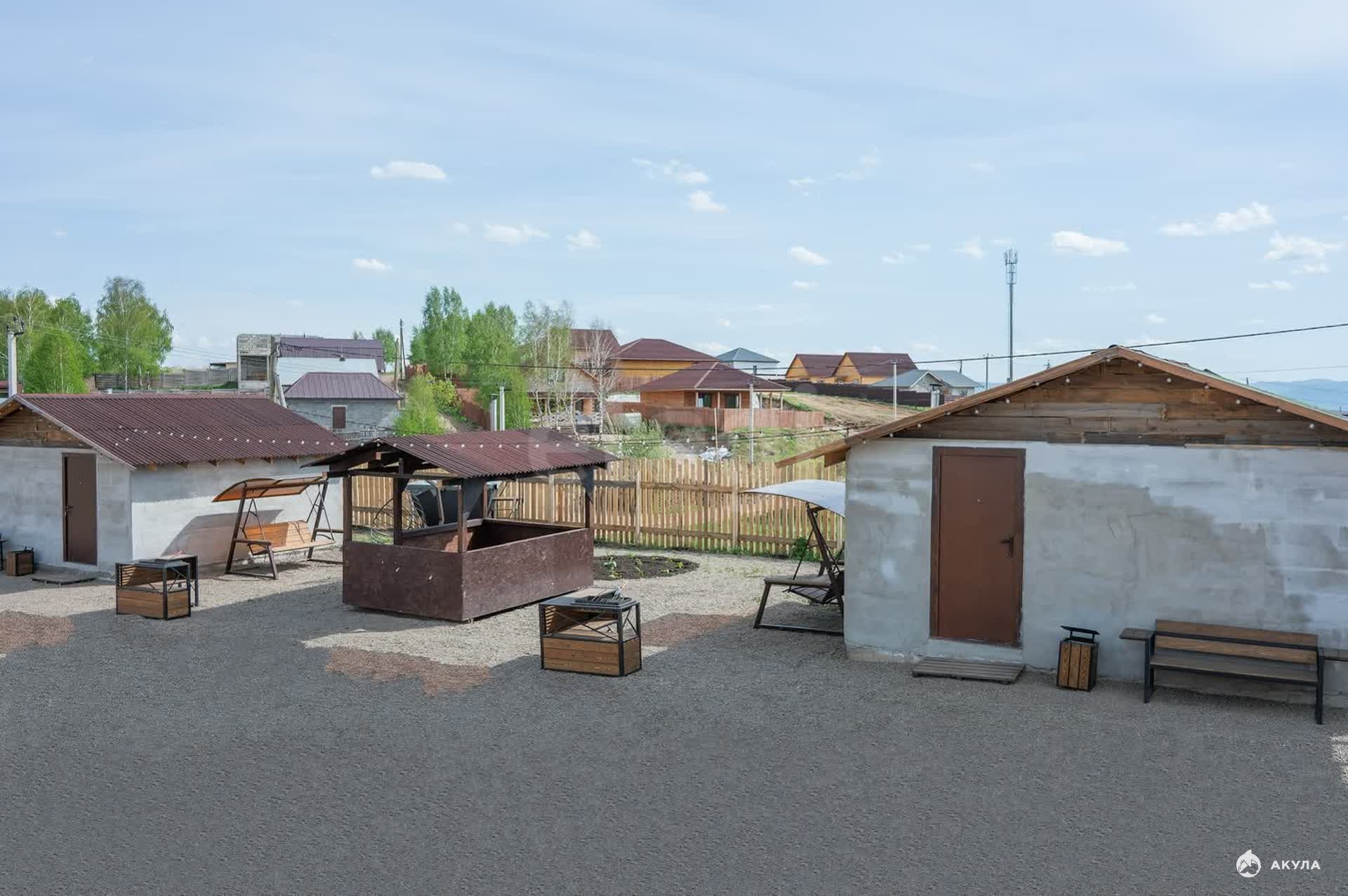 Территория площадью 11 соток отсыпана мелкой галькой, имеются две мангальные зоны, открытая беседка и качели.