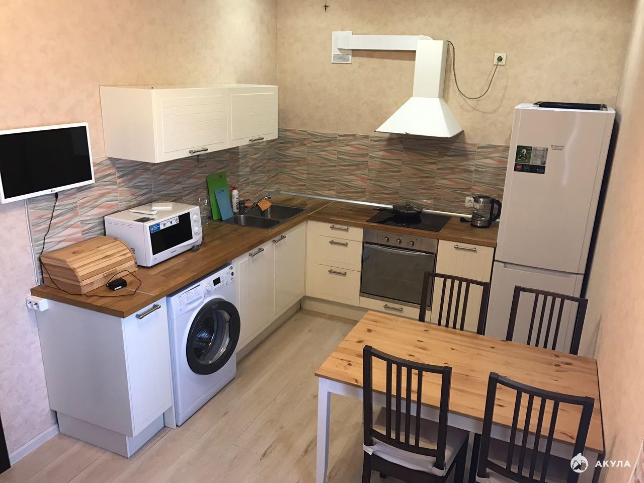 стиральная машинка автомат, холодильник, плита, телевизор, чайник, микроволновка, утюг.