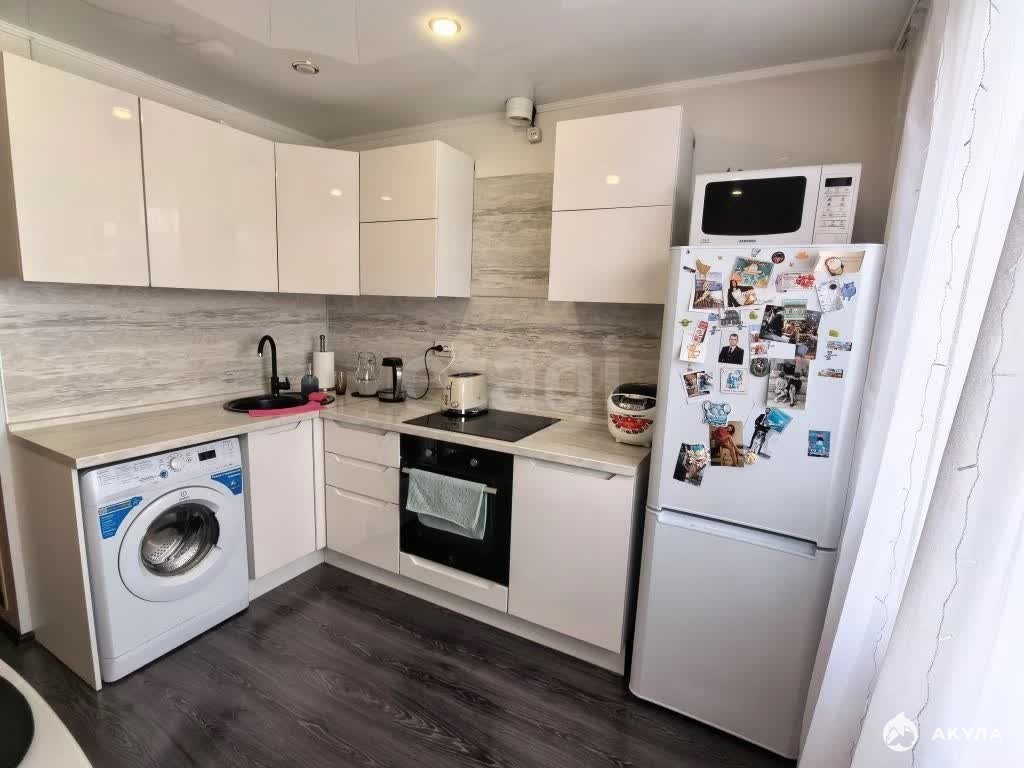 В квартире выполнен качественный евроремонт. В квартире остаётся кухонный гарнитур, два встроенных шкафа и кондиционер.