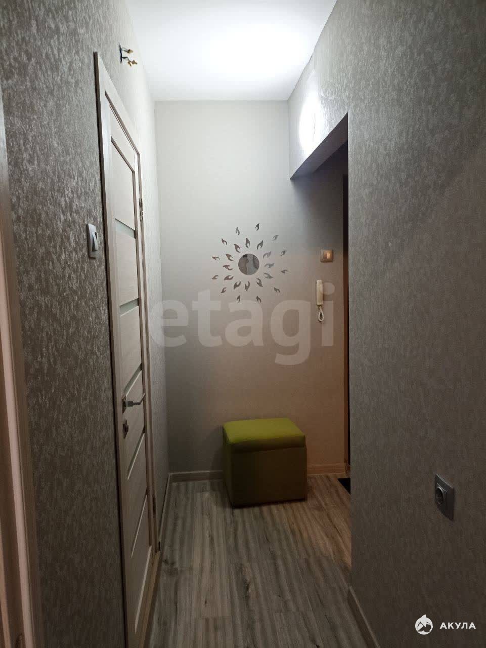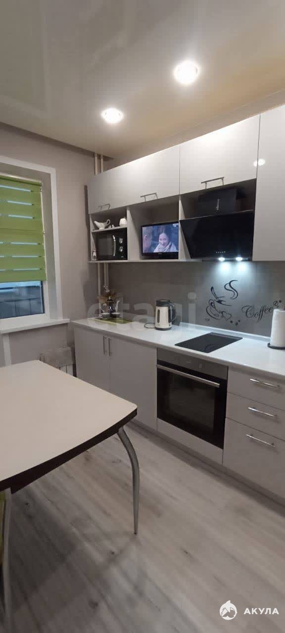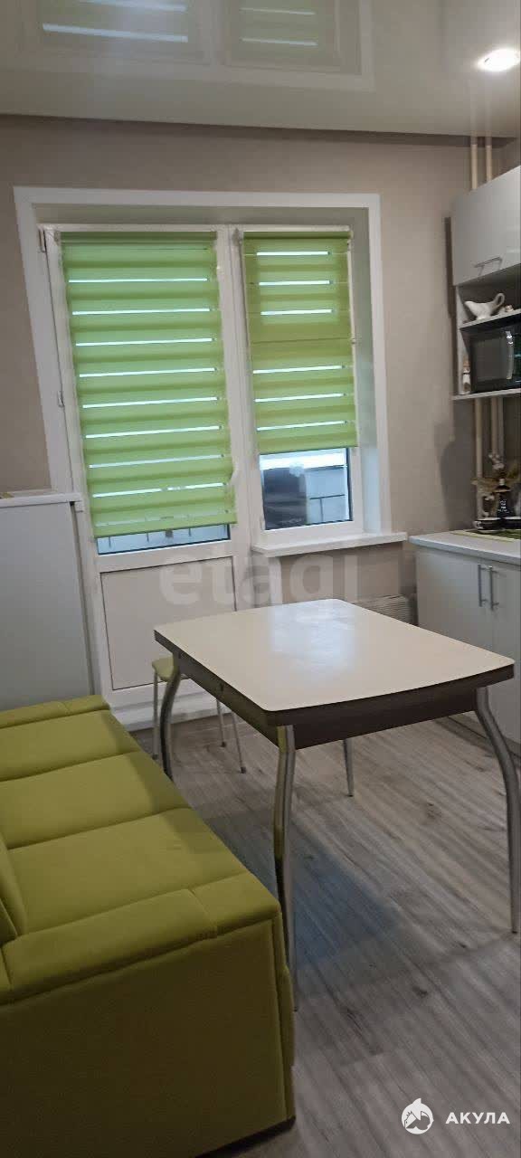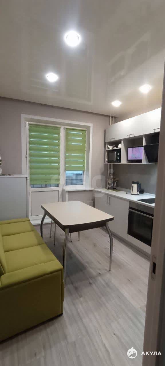 Просторная кухня оборудована всей необходимой техникой, включая микроволновую печь и духовой шкаф. Из кухни выход на балкон, откуда открывается вид во двор. В комнате установлен вместительный шкаф-купе, удобный диван.