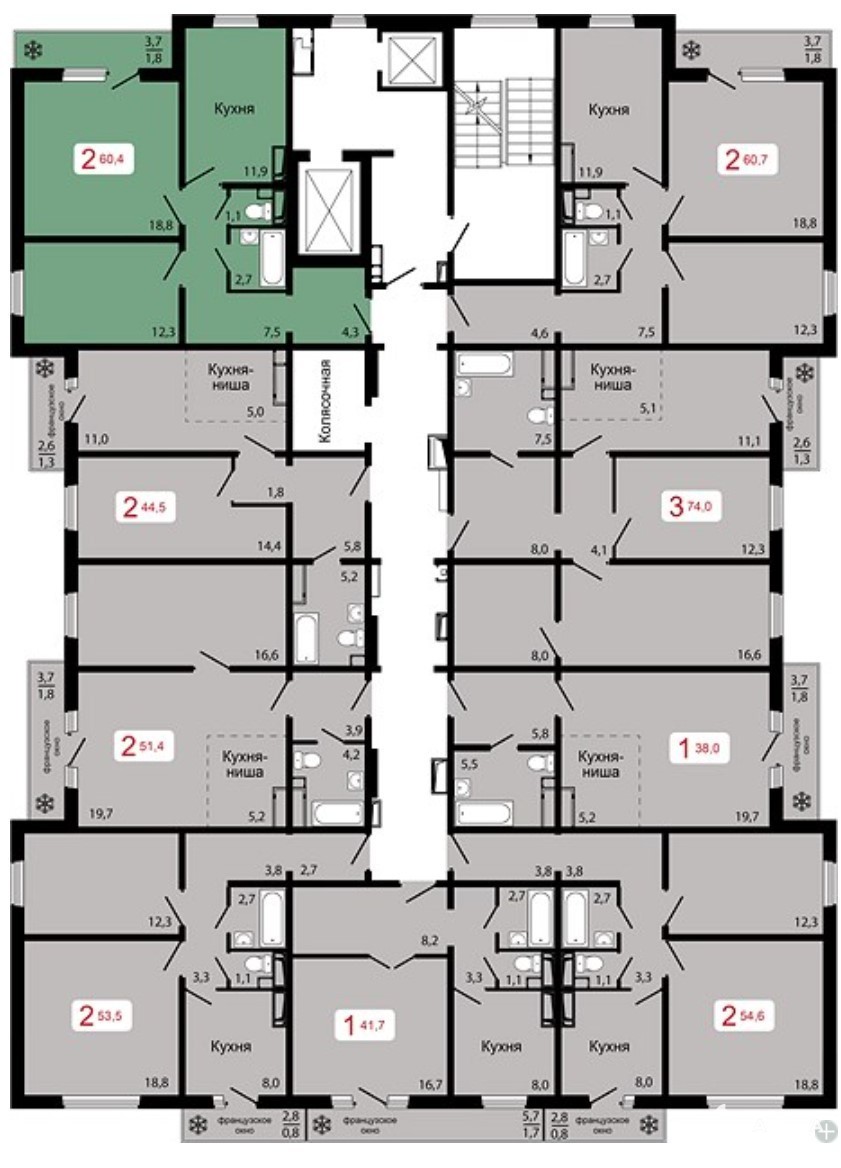 разнообразные классические и европланировки квартир: 1-комнатные площадью от 40-76 м2, 2-комнатные - 46-63 м2, 3-комнатные - 75-76 м2,
