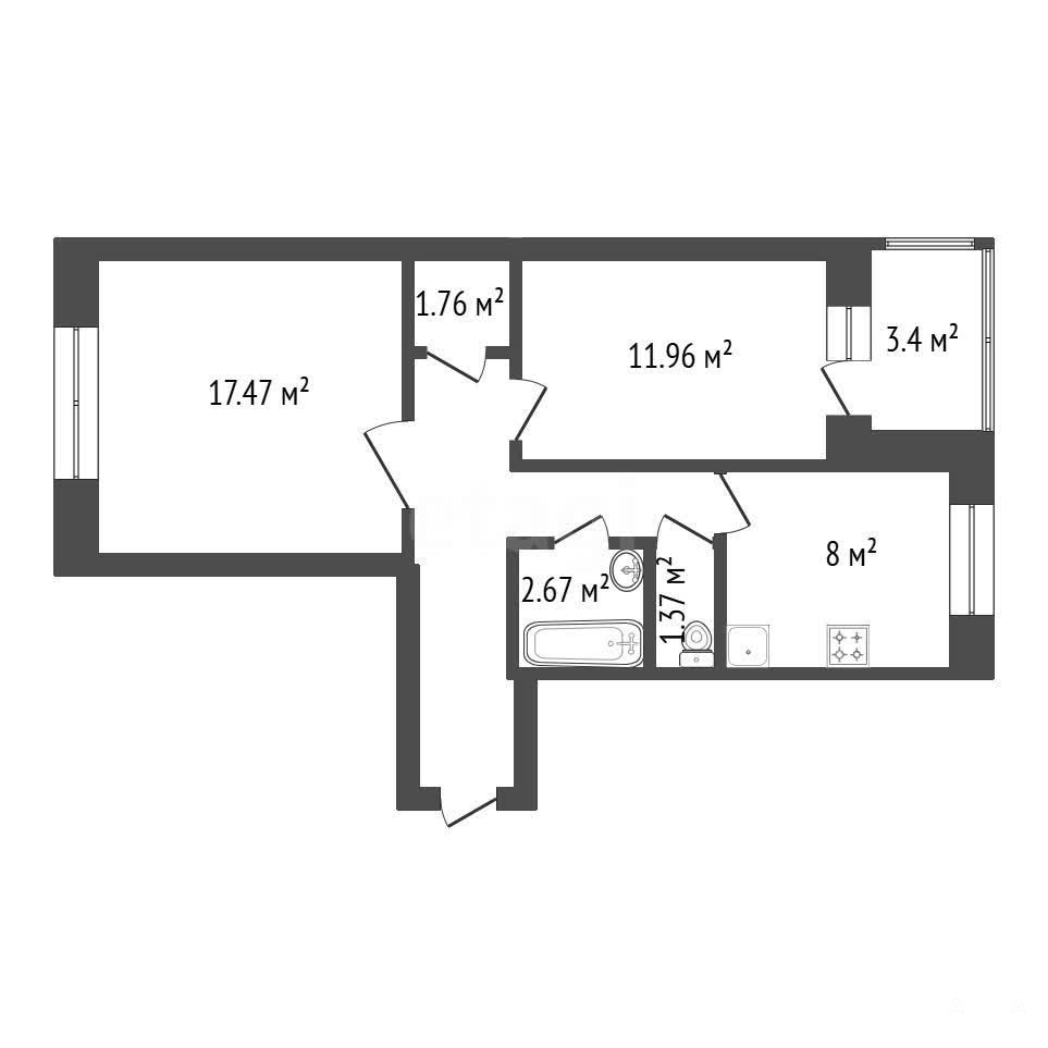 Общая площадь 54, 6 кв.м., планировка на две стороны: просторная гостиная 17, 5 кв.м., комната 12 кв.м. с выходом на лоджию, кухня квадратной формы 8, 1 кв.м., раздельный санузел, в прихожей гардеробная.