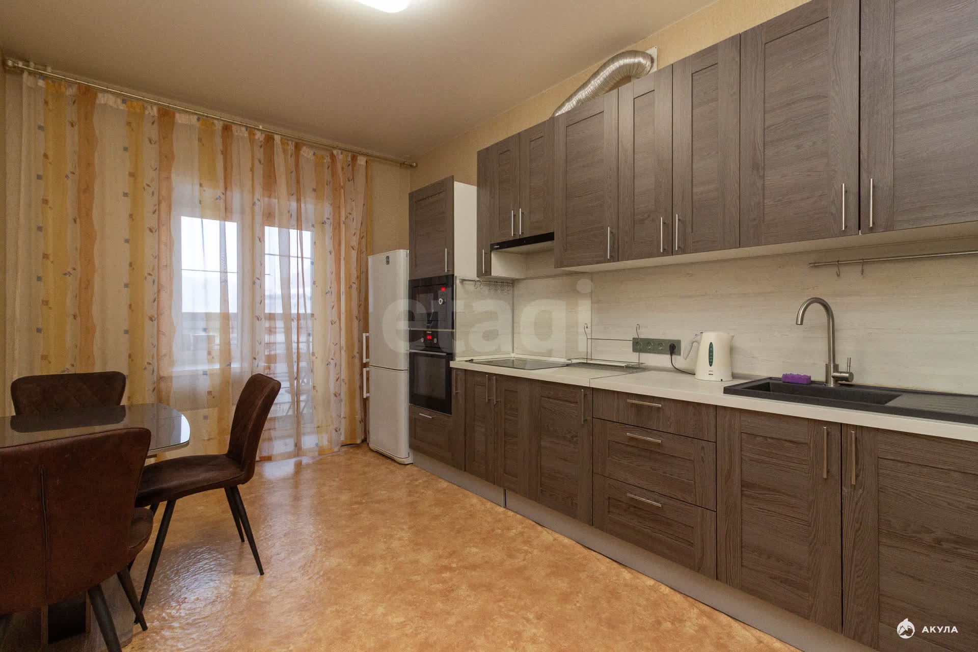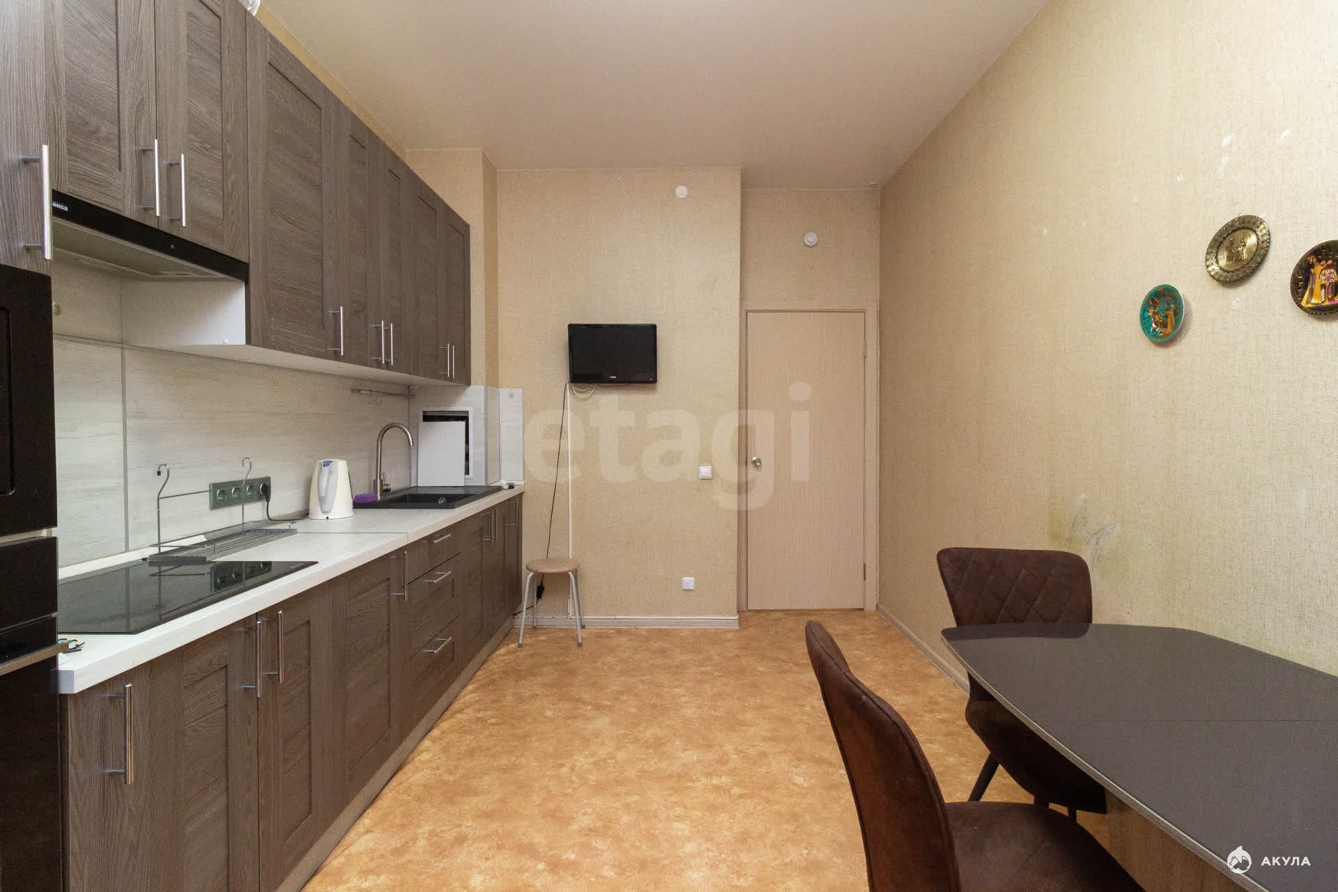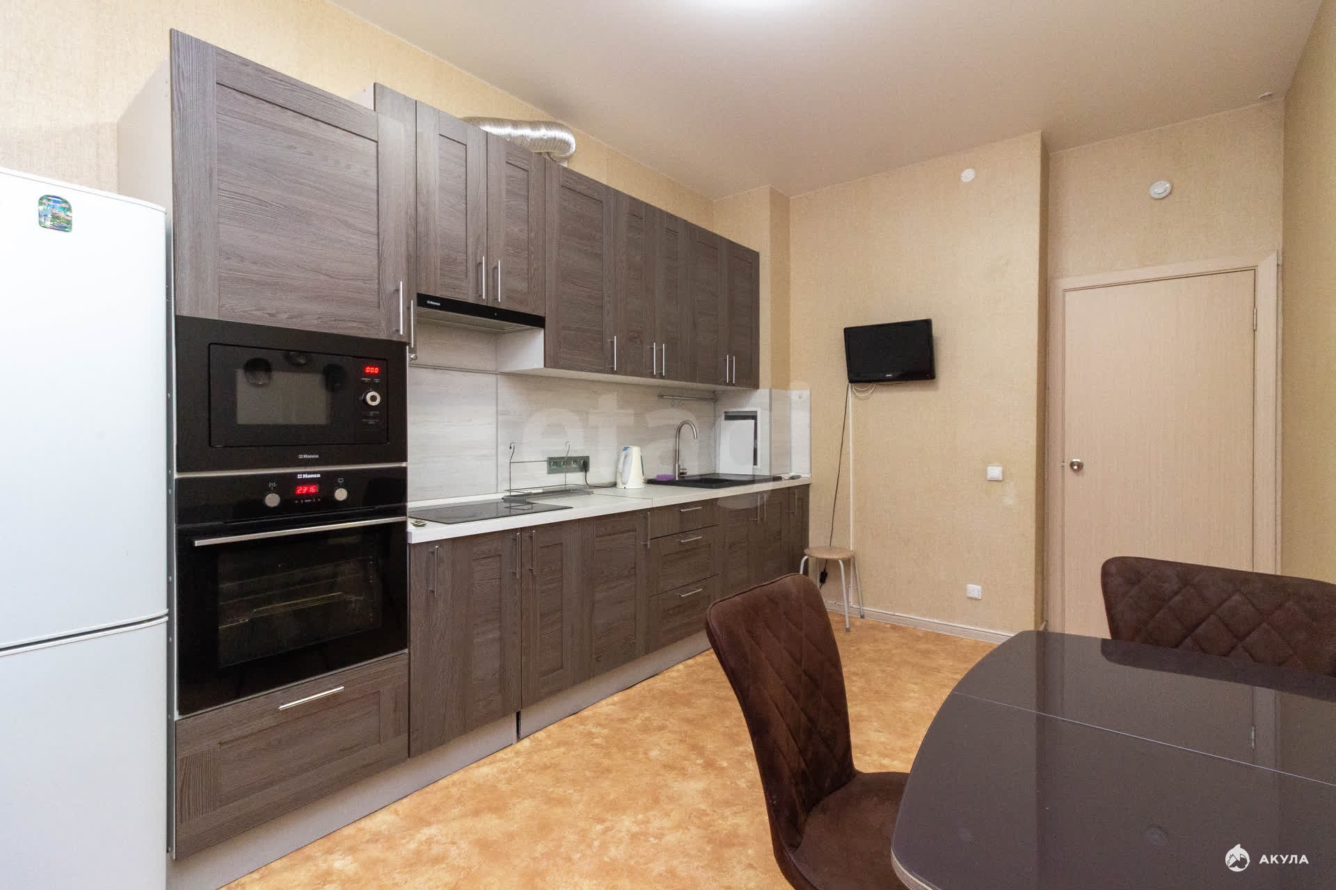 Ключевым преимуществом является просторная кухня площадью 12 кв. м, оснащенная качественным кухонным гарнитуром на заказ и всей необходимой встроенной техникой, которая остается новому владельцу: индукционная варочная панель, духовой шкаф, микроволновая печь и холодильник.