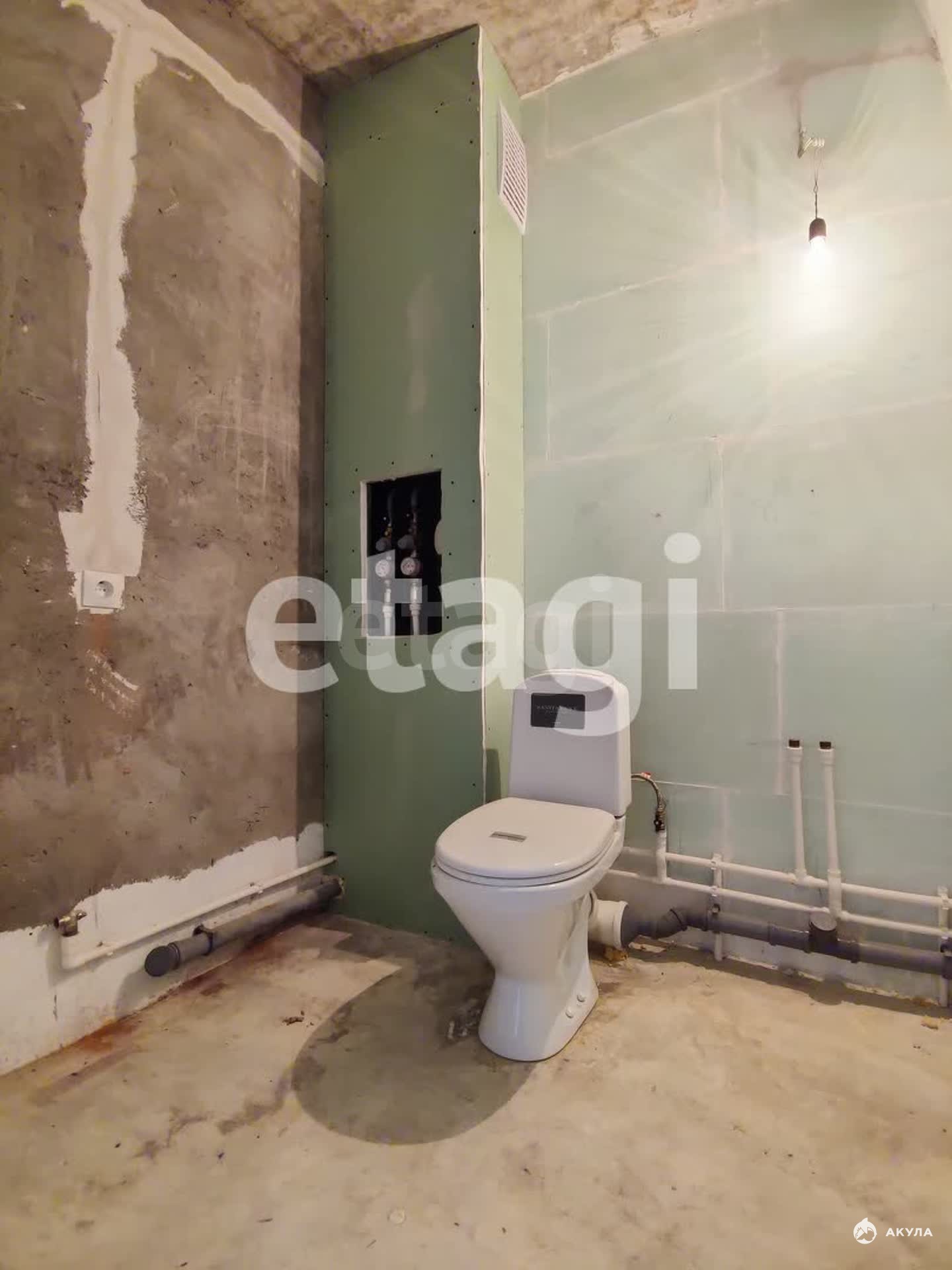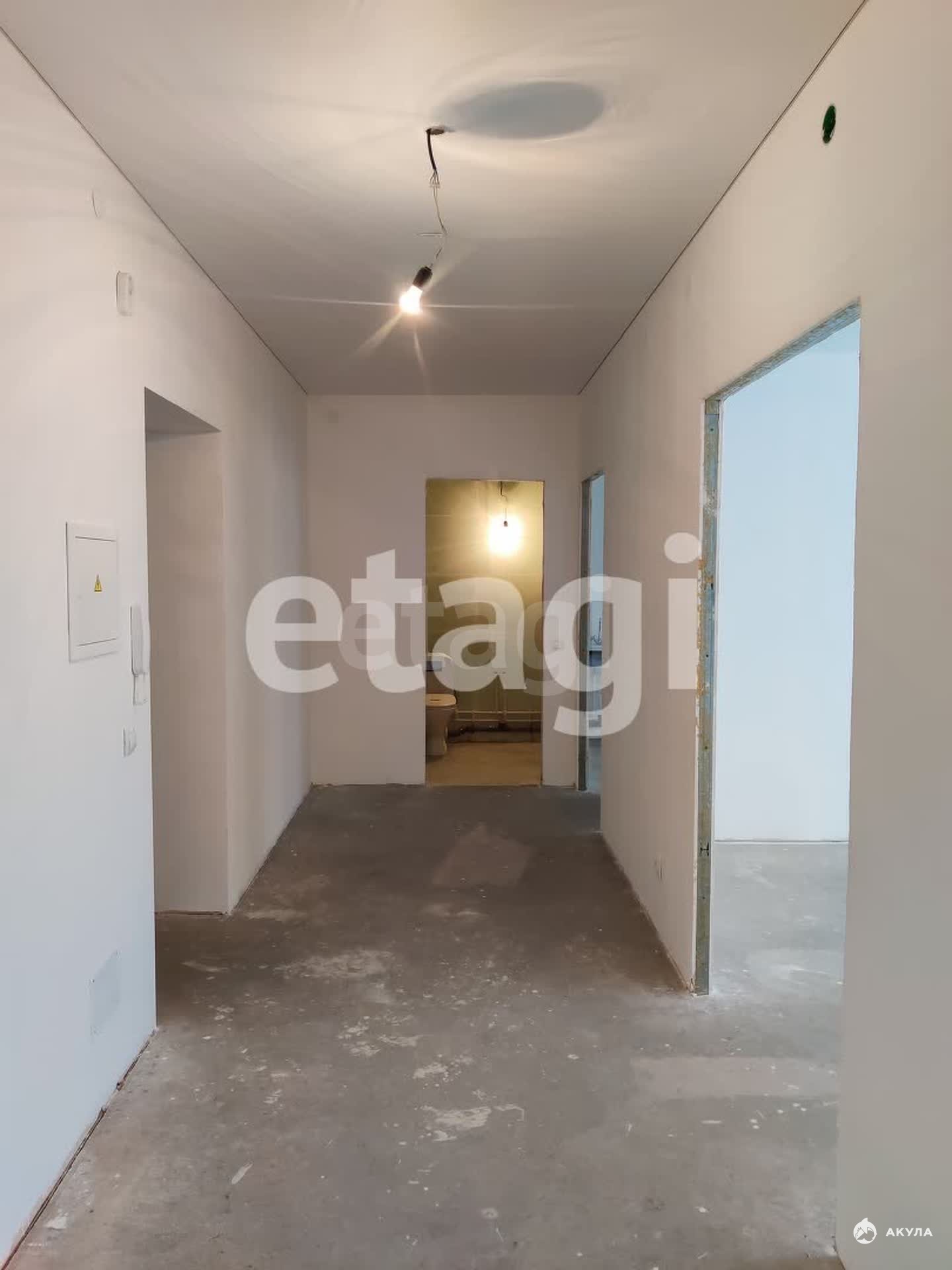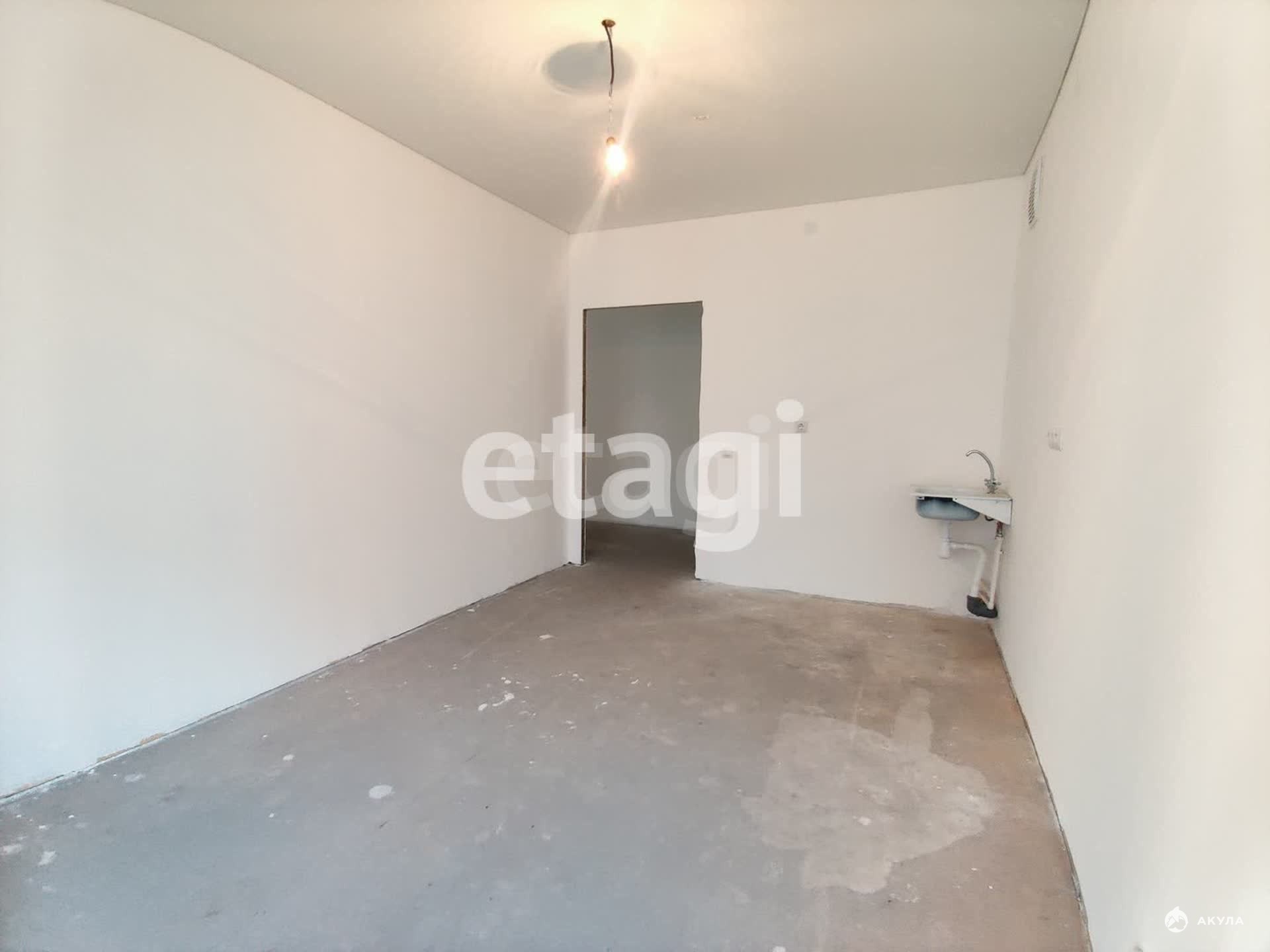Квартира в отделке белый куб: стяжка на полу, стены выровнены, натяжной потолок, раковина на кухне, унитаз в санузле.