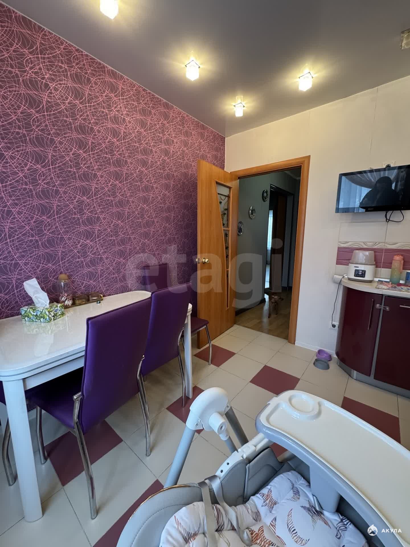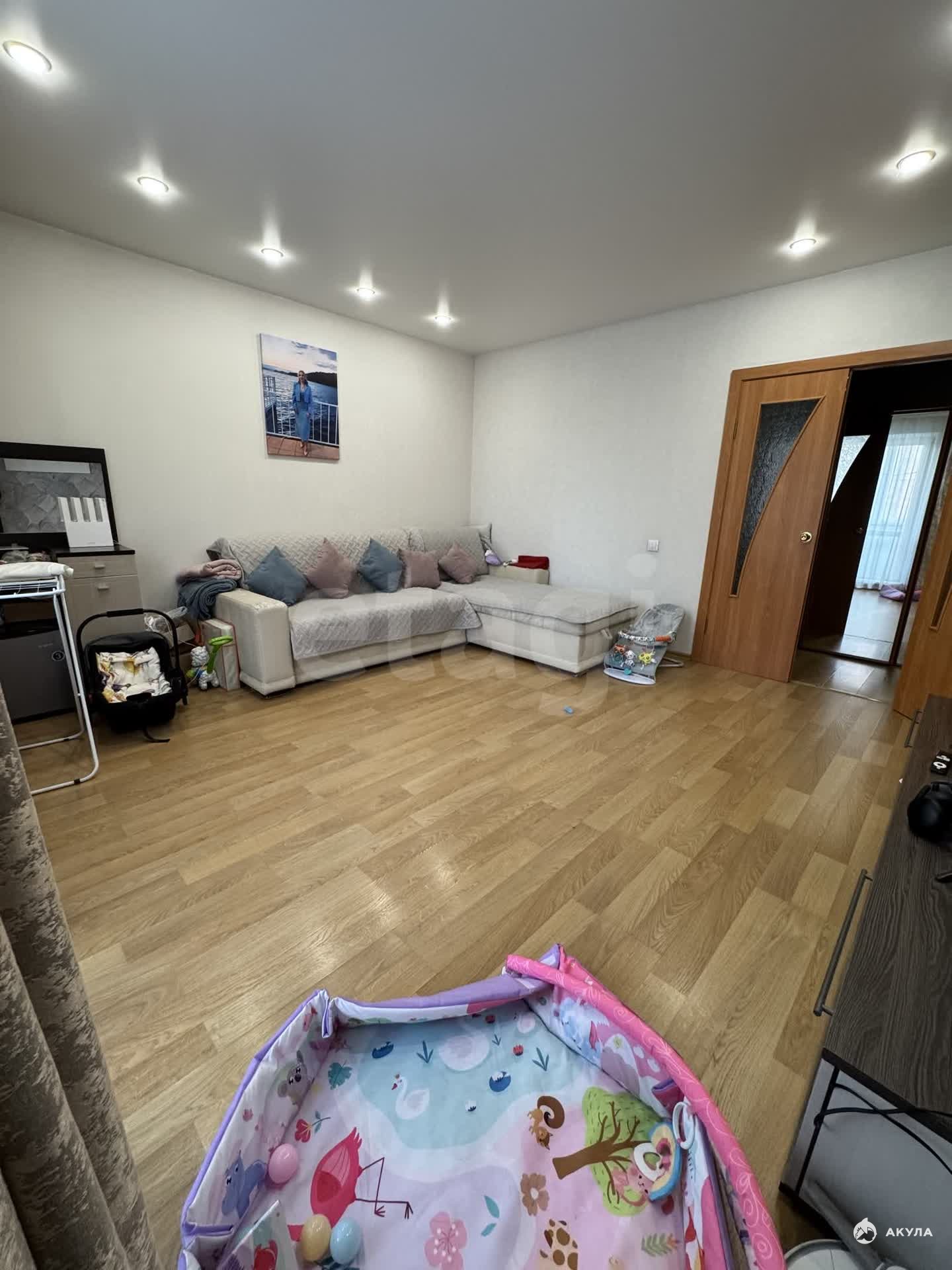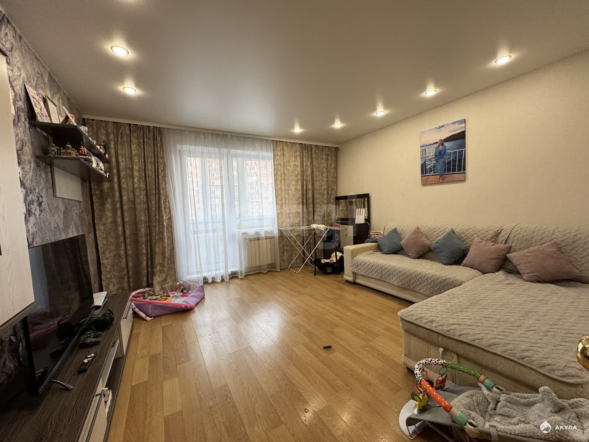В квартире натяжной потолок( кроме коридора). На полу ламинат. Санузел раздельный (в кафеле). Балкон застеклён (ПВХ). При продаже в квартире останется кухонный гарнитур с вытяжкой, диван и 2 встроенных шкафа.