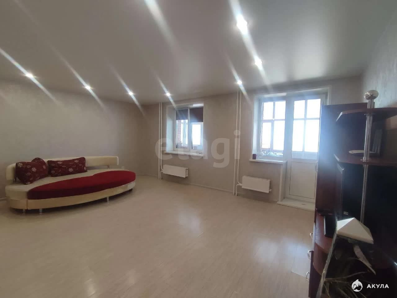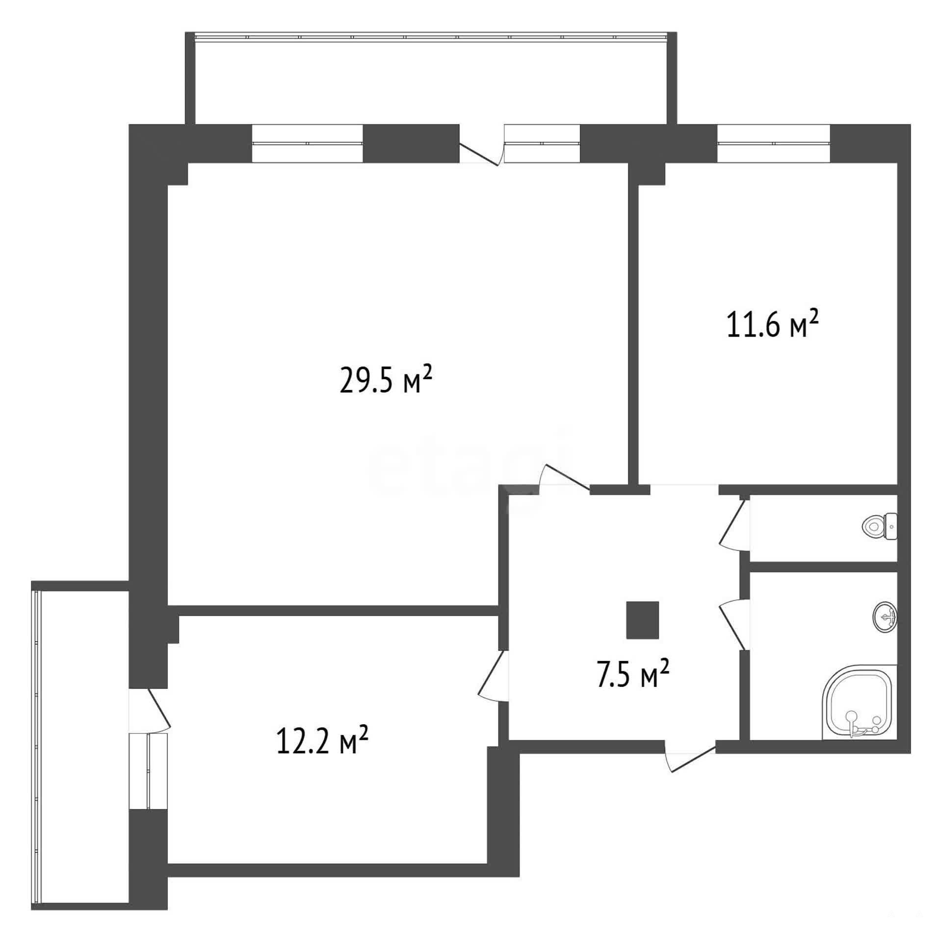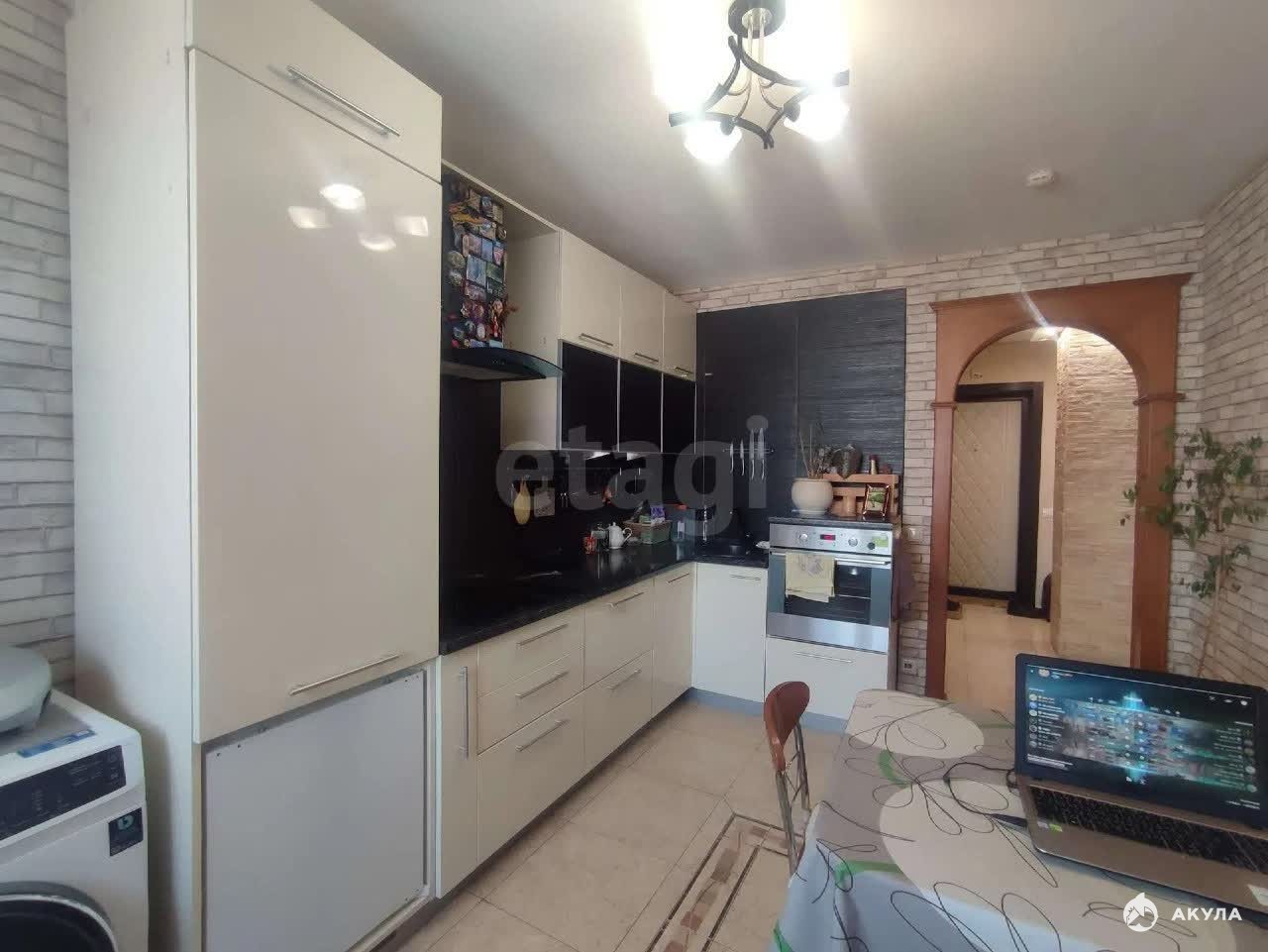 Ключевое преимущество объекта — планировка, позволяющая легко преобразовать большое помещение гостиной площадью 29, 5 кв. м с двумя окнами в дополнительную комнату с балконом, фактически получив трехкомнатную квартиру. Отдельная спальня 12, 2 кв. м имеет выход на балкон. Кухня размером 11, 6 кв. м полностью укомплектована современной встроенной мебелью и бытовой техникой, которая остается новому владельцу. В квартире выполнен аккуратный косметический ремонт, раздельный санузел облицован кафелем, а квадратная прихожая площадью 7, 5 кв. м добавляет ощущение простора.