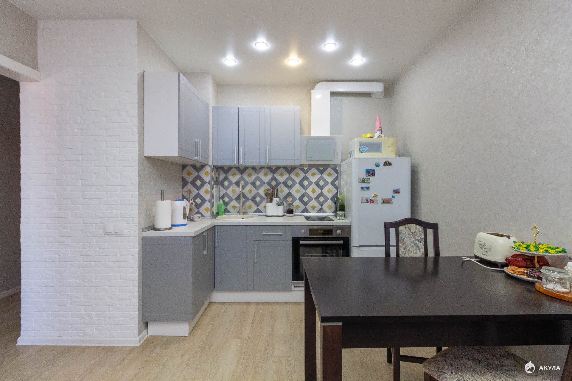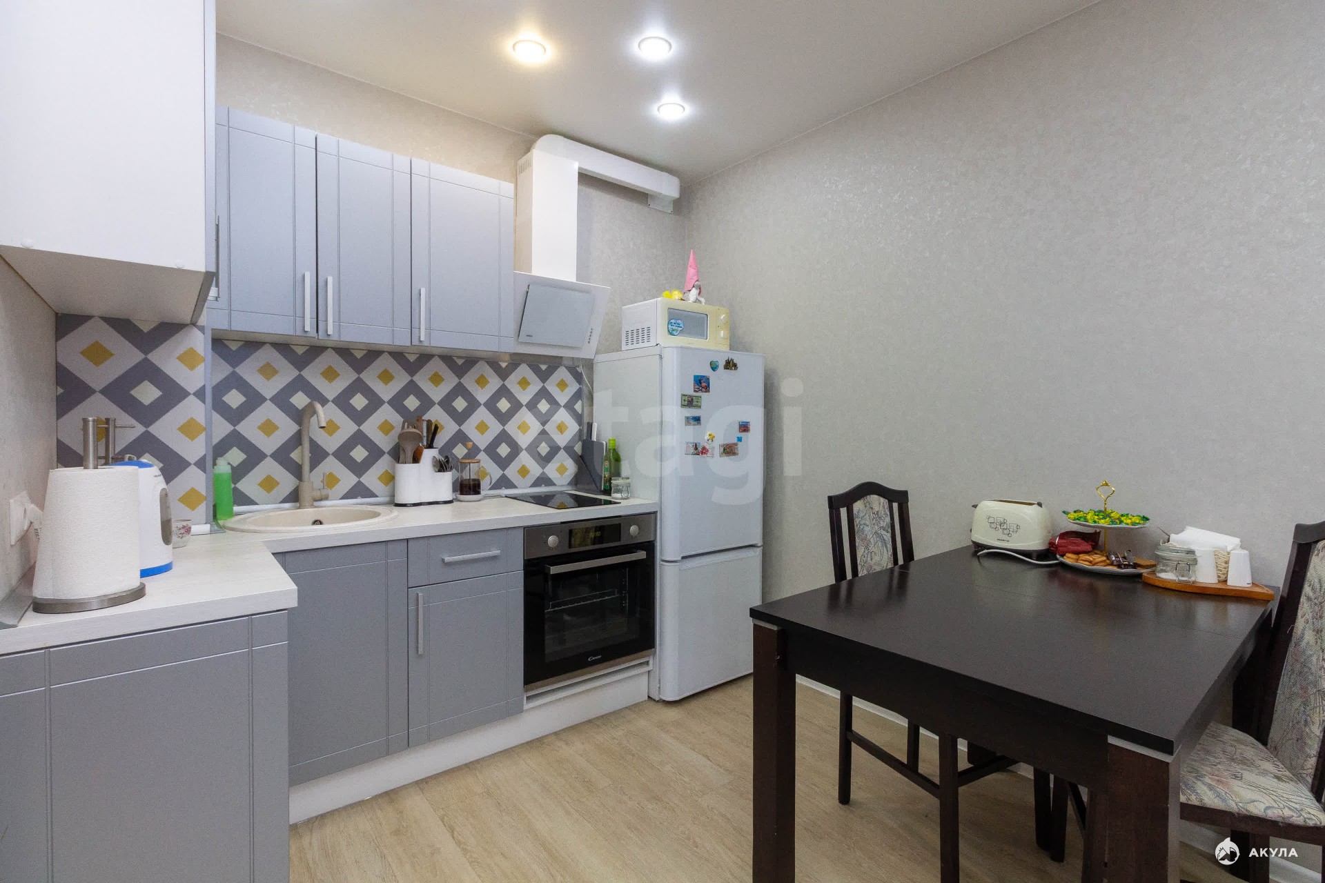 Все готово к переезду: Вам не нужно тратиться на мебель и технику! Мы оставляем стильный кухонный гарнитур со всей встроенной техникой (панель, духовой шкаф, вытяжка, холодильник), бойлер в ванной и вместительный встроенный шкаф в спальне.