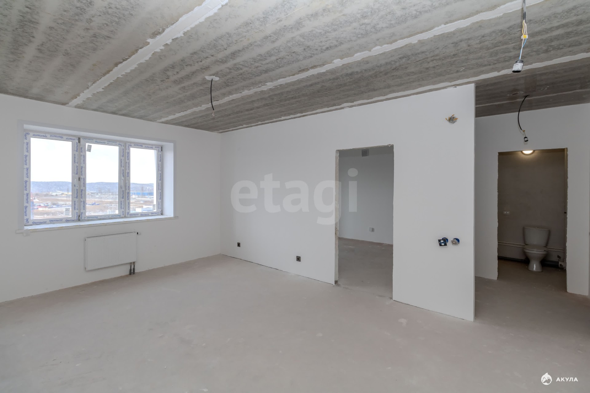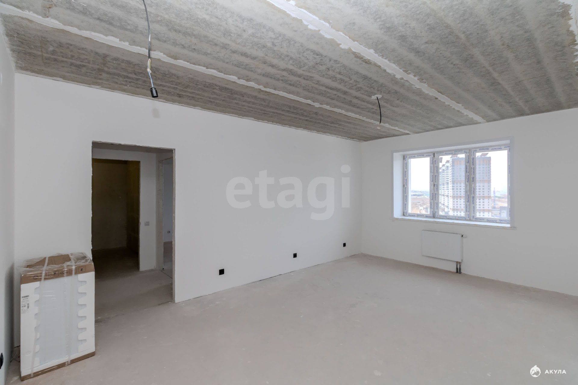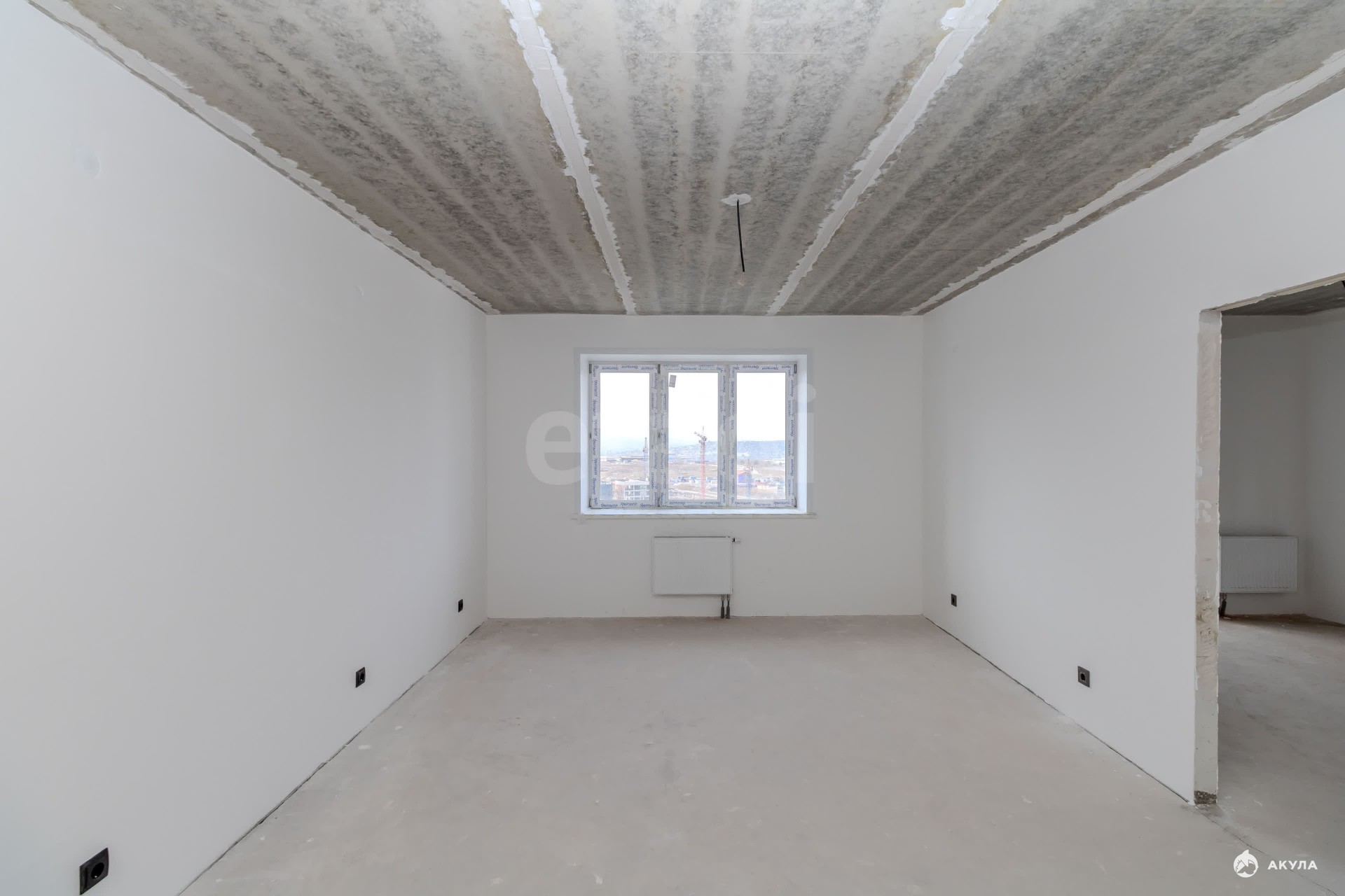 Квартира находится в состоянии "Белый куб": стены оштукатурены, полы выровнены для укладки финишного покрытия, что дает возможность создать интерьер по индивидуальному проекту.
