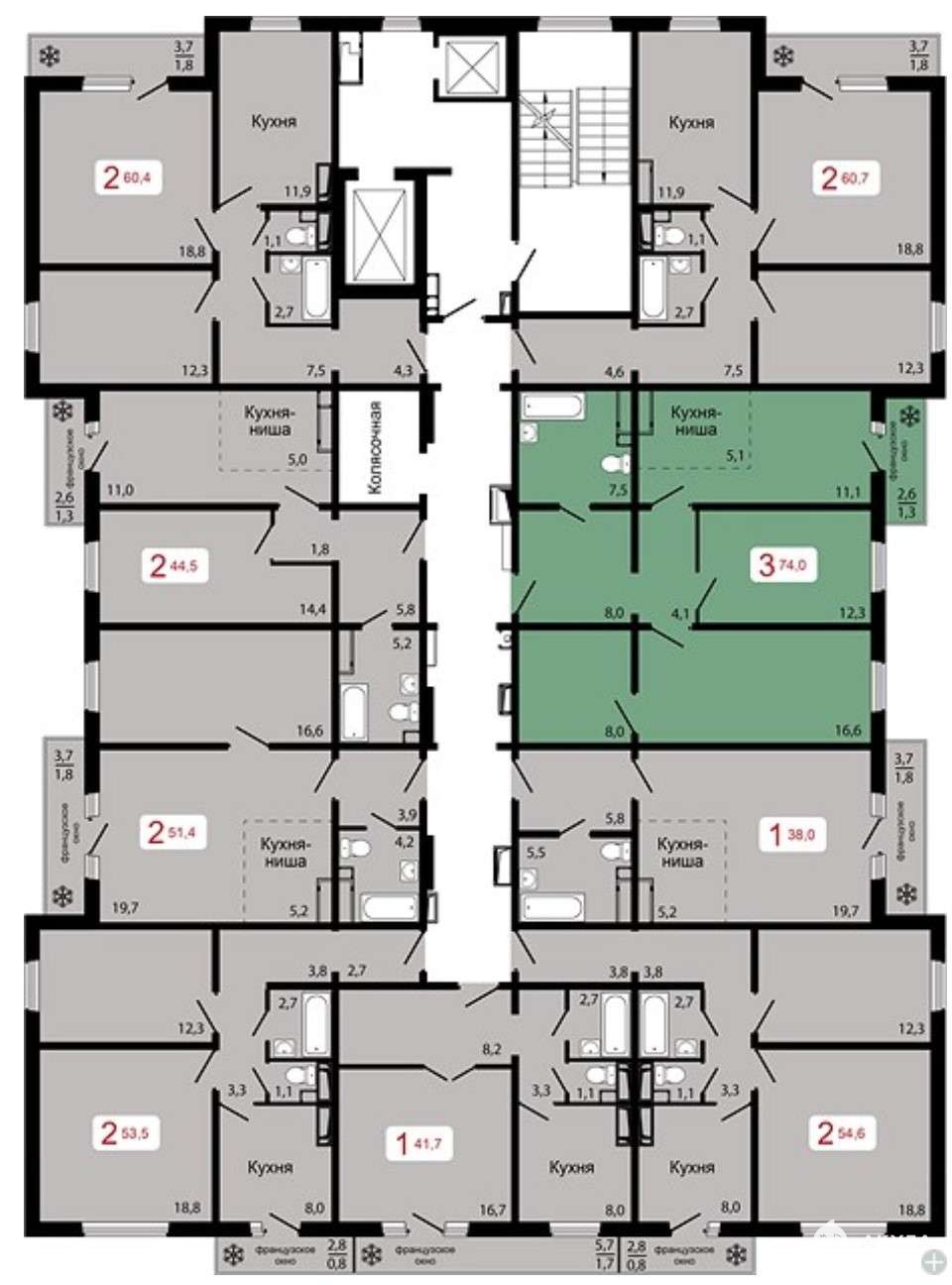 разнообразные классические и европланировки квартир: 1-комнатные площадью от 40-76 м2, 2-комнатные - 46-63 м2, 3-комнатные - 75-76 м2,