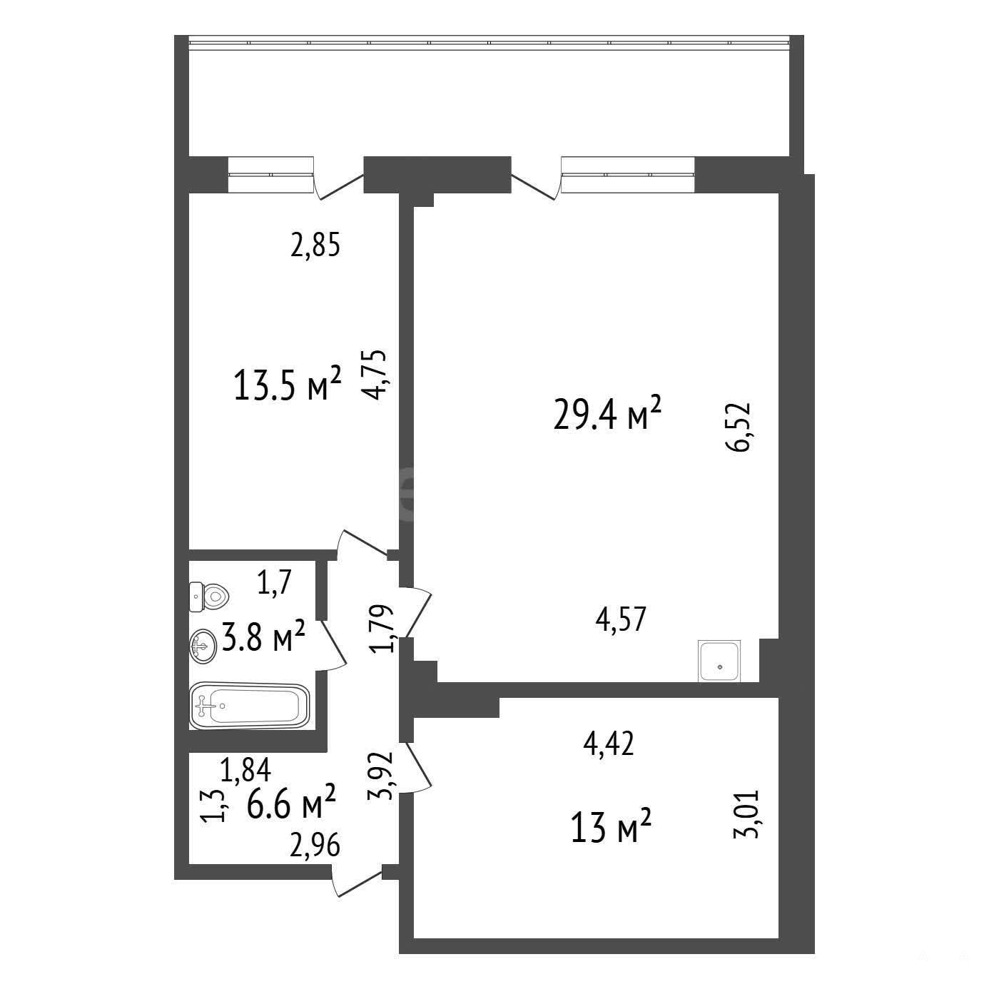Общая площадь 66.3 кв. м включает кухню-гостиную 29, 4 кв. м, две изолированные спальни (13 и 13, 5 кв. м) и остеклённый балкон 9 кв. м с двумя выходами.