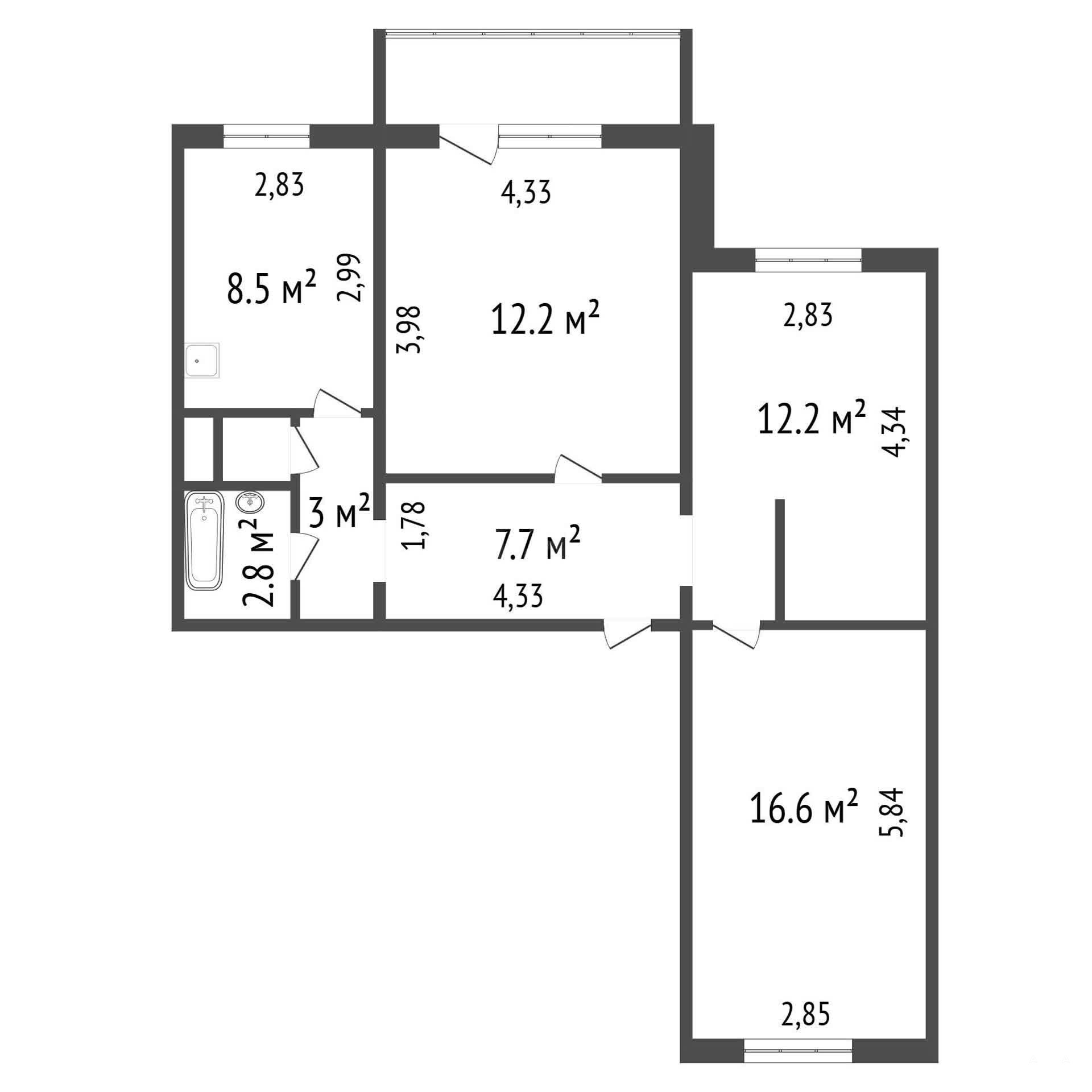 - две просторных комнаты на 16.6м2 и 12.2м2