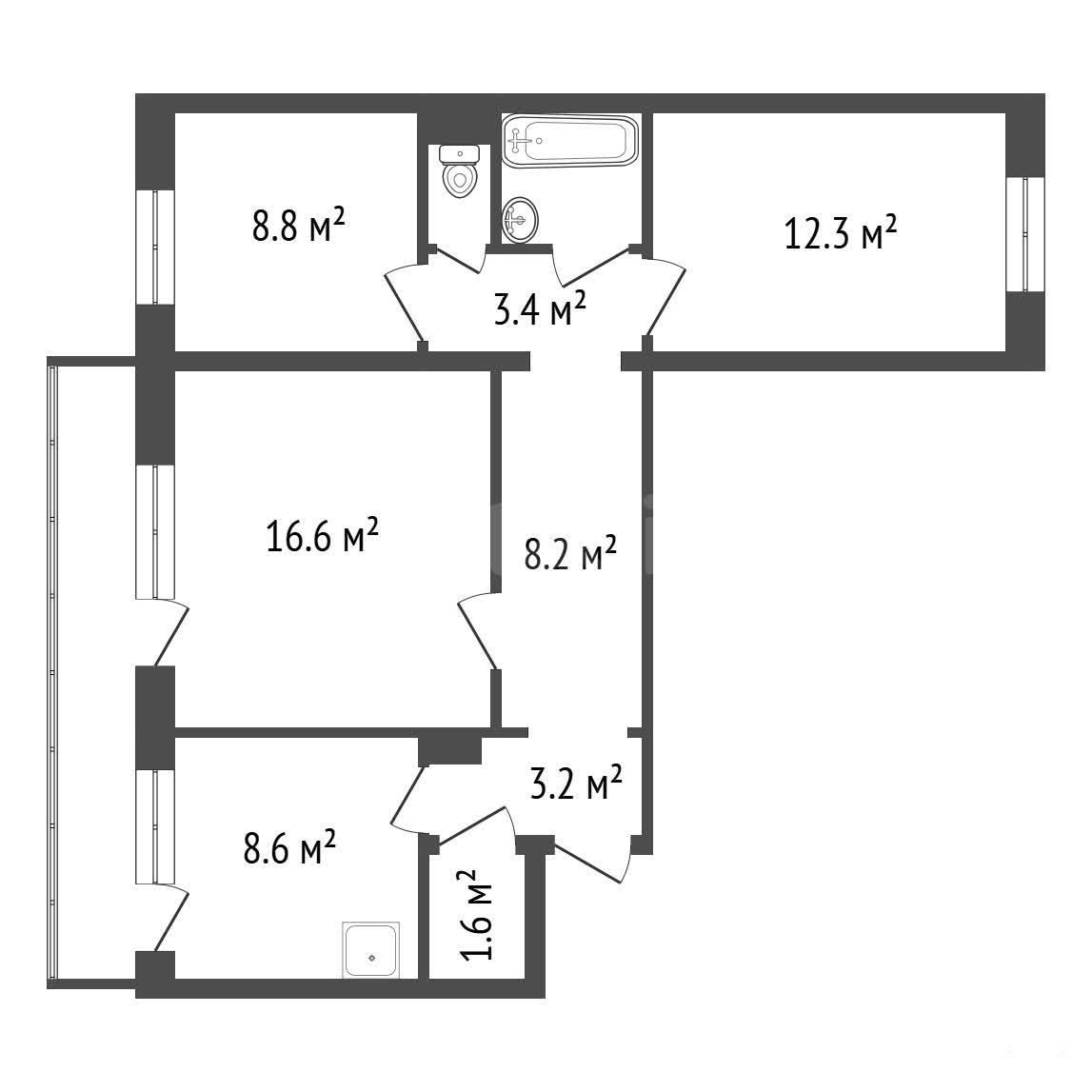 Просторная кухня 9 м² и раздельный санузел.