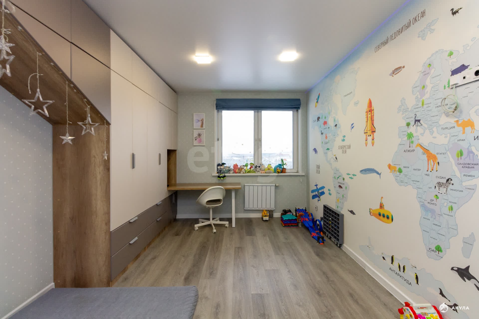 Натяжные потолки фирмы Блейхерт — с квадратными светильниками и световыми линиями в двух детских, на кухне также световая линия для хорошего освещения кухонной зоны (подсветка рабочей поверхности присутствует), всё разделено выключателями по зонам.