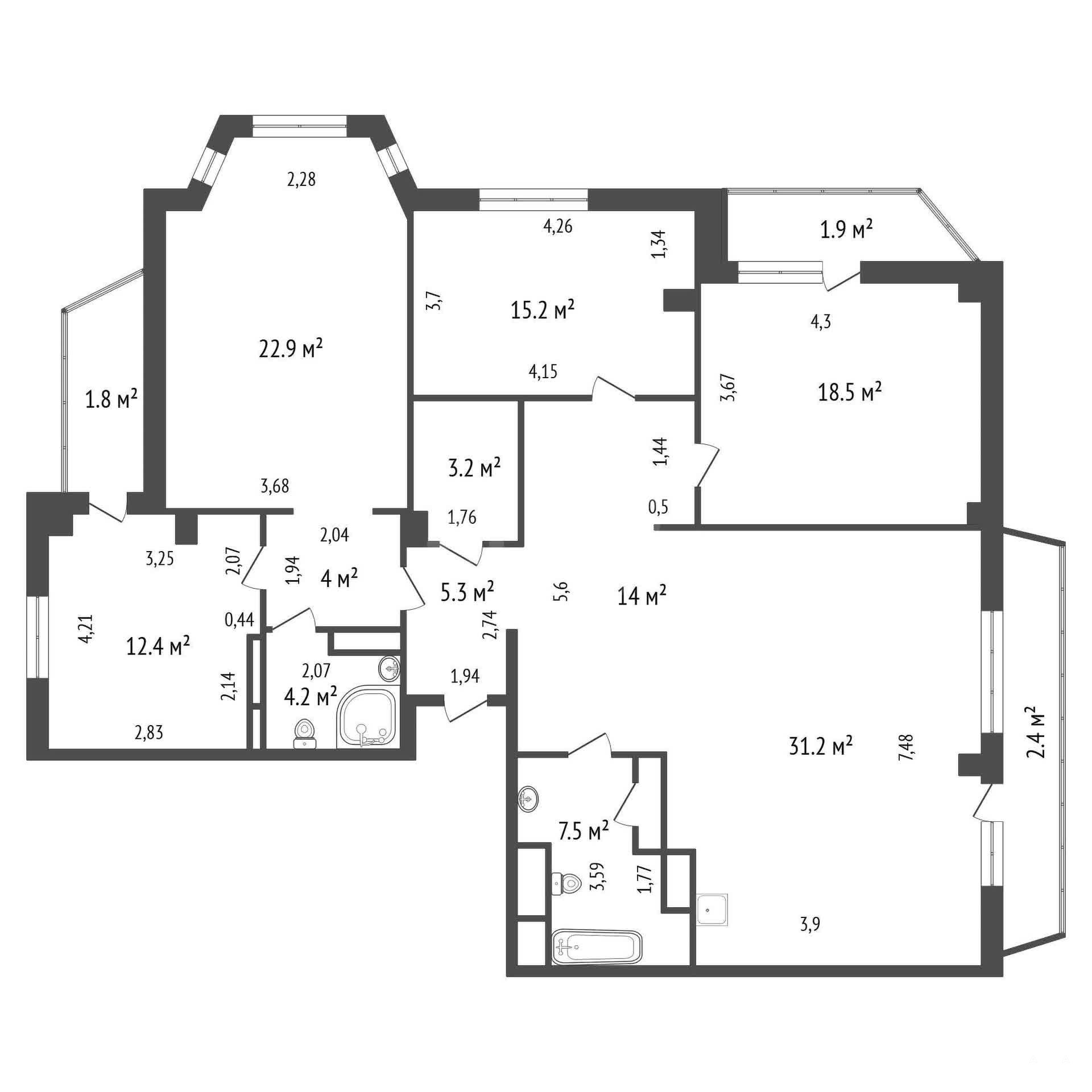 Планировка включает три изолированные комнаты, две раздельные ванные комнаты и три лоджии, что значительно увеличивает полезное пространство.