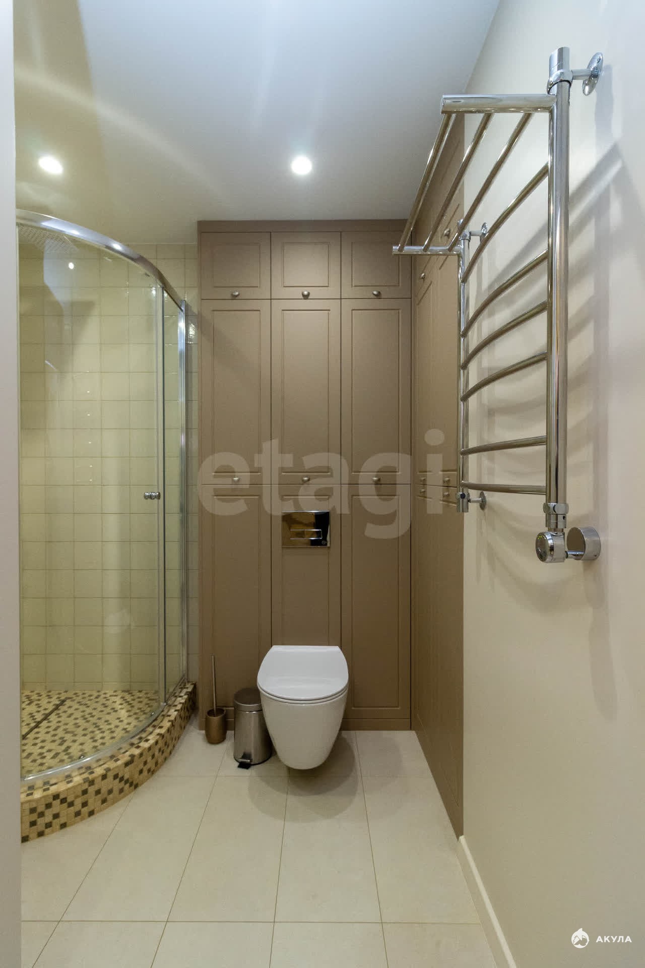 В отделке использованы качественные материалы (Ремонт по дизайн проекту): в зонах с кафельным покрытием смонтирована система теплого пола, установлена элитная сантехника и два кондиционера.