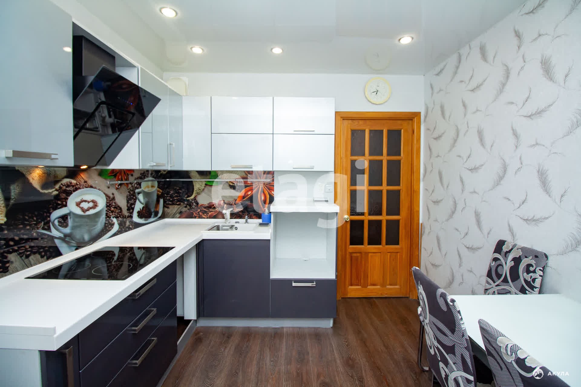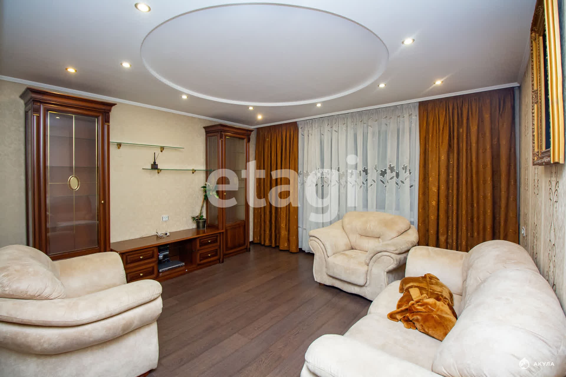 На кухне остается встроенный современный кухонный гарнитур с обеденной группой. В коридоре — вместительная прихожая. В зале вы найдете диван с креслами и стильную стенку, а в спальнях — удобную мебель.