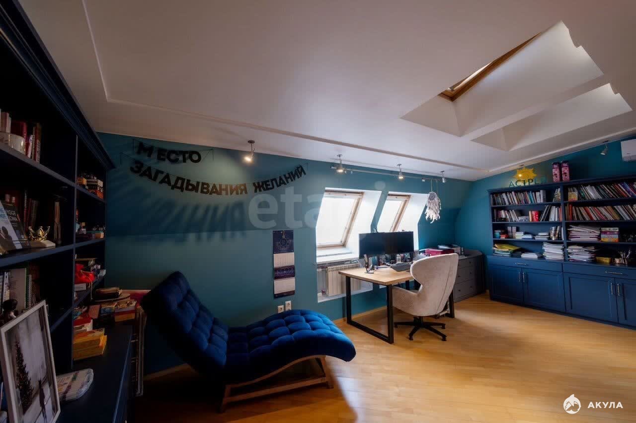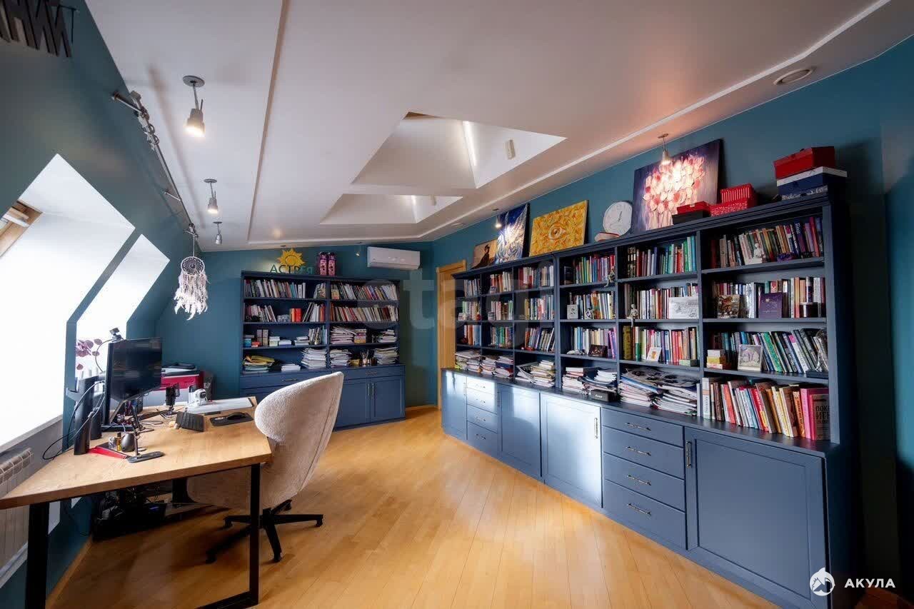 Три гардеробные комнаты, а в спальной зоне уже организовано удобное рабочее место с книжными стеллажами.