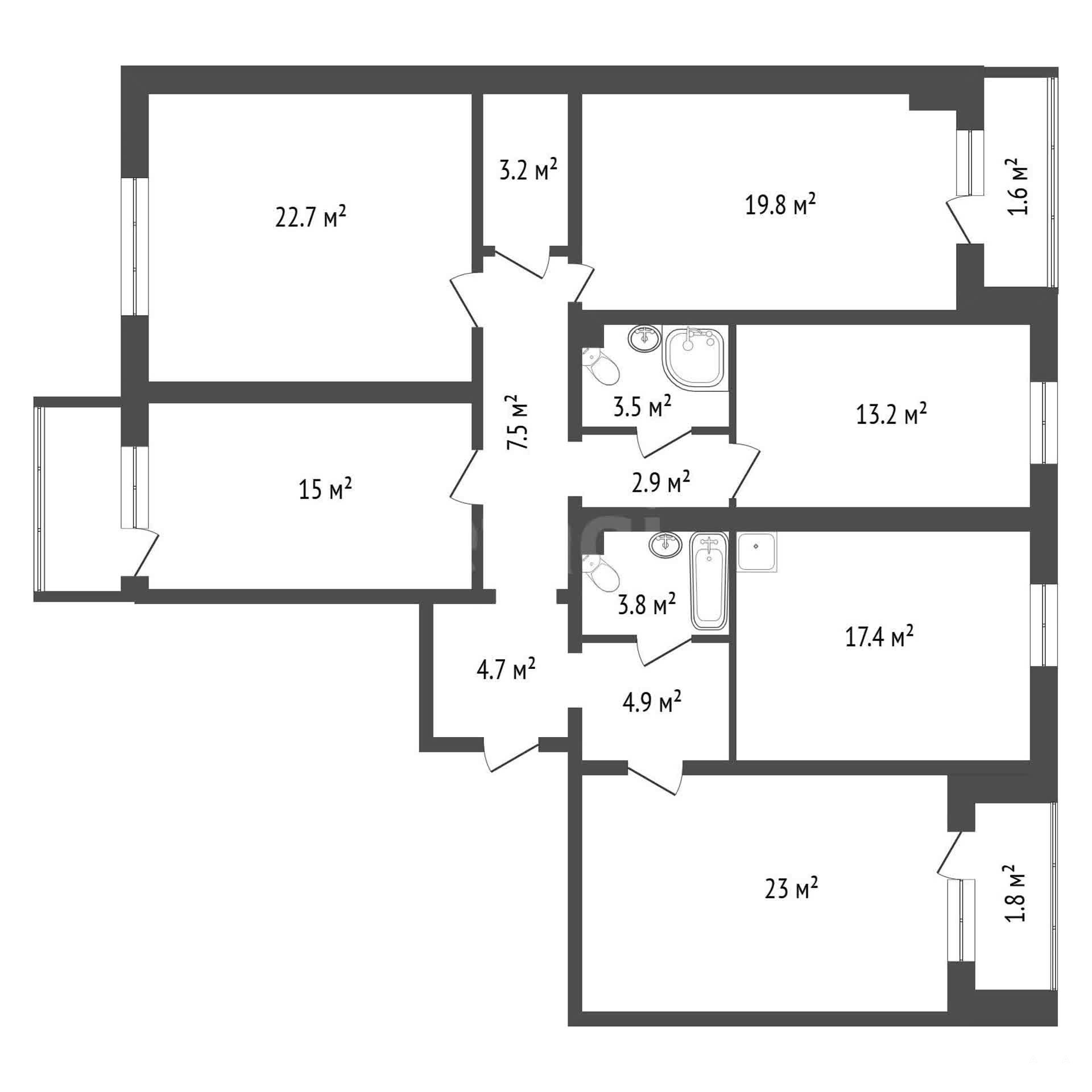 В квартире две застеклённые лоджии плюс застеклённый балкон. Два санузла.