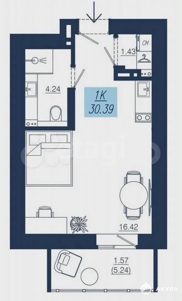 Квартира имеет выгодную планировку с жилой зоной 28.8 м² и совмещенным санузлом, а также собственный балкон с видом во двор. Высота потолков составляет 2.6 метра.