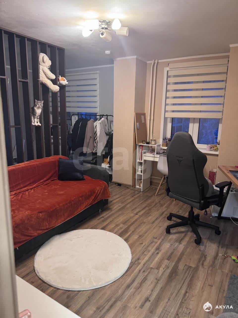 Ключевым преимуществом объекта является грамотное зонирование: пространство разделено на уютную спальную зону и гостевую область при помощи стильной перегородки из цельной древесины, изготовленной на заказ и дополненной функциональными полками.