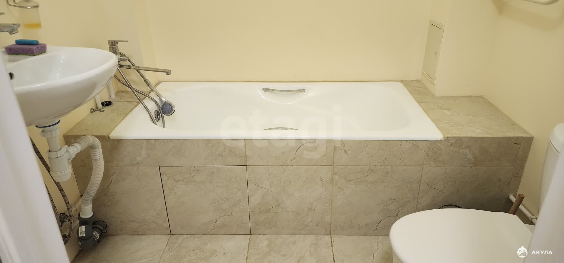 Ванная закрыта экраном и применена отделка плиткой.