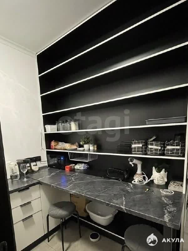 На кухне есть вместительный стеллаж, который выполняет функцию зонирования между кухней и спальным местом.