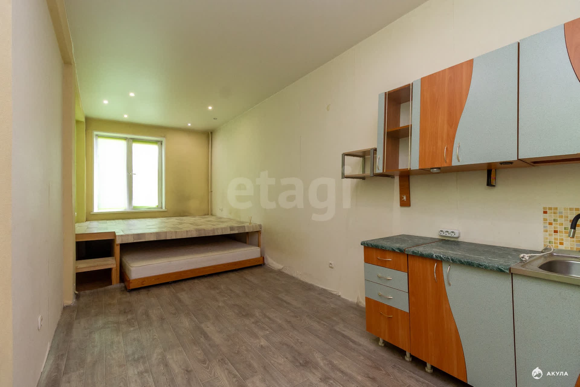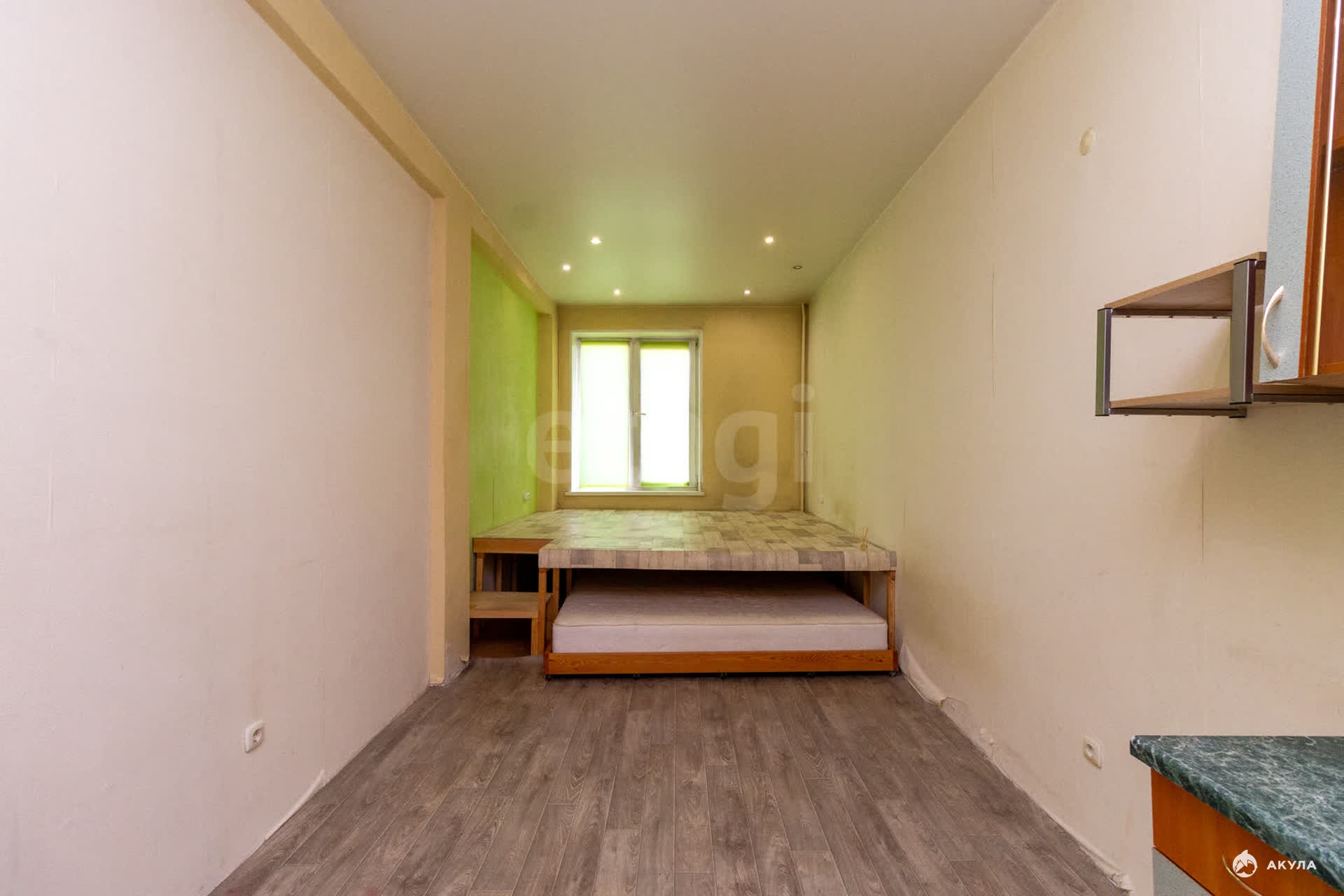Продаётся студия в экологически чистом микрорайоне, общая площадь 33 м2, на 3 этаже. Высокие потолки создают ощущение простора . Продуманна система зонирования, есть подиум и откатное спальное место, что даёт возможность использовать выгодно жилое пространство. В квартире выполнен косметический ремонт. Совмещенный санузел в кафеле. Остаётся кухонный гарнитур. В коридоре есть система хранения вещей, что очень удобно и практично.