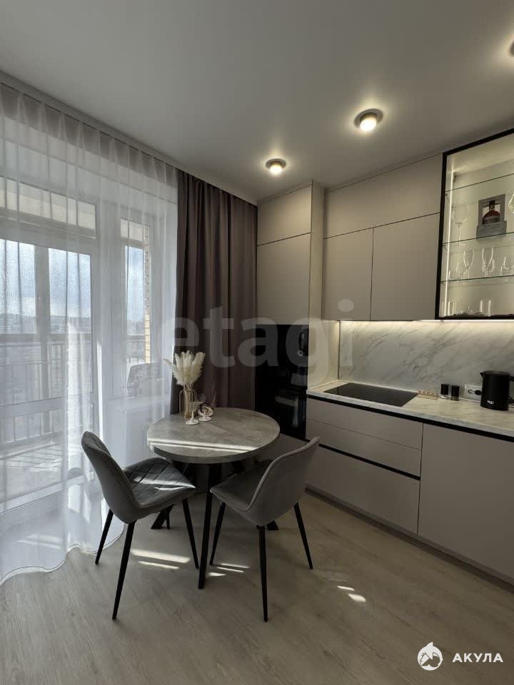 Просторная кухня оборудована встроенной техникой, включая холодильник и посудомоечную машину.