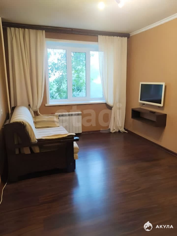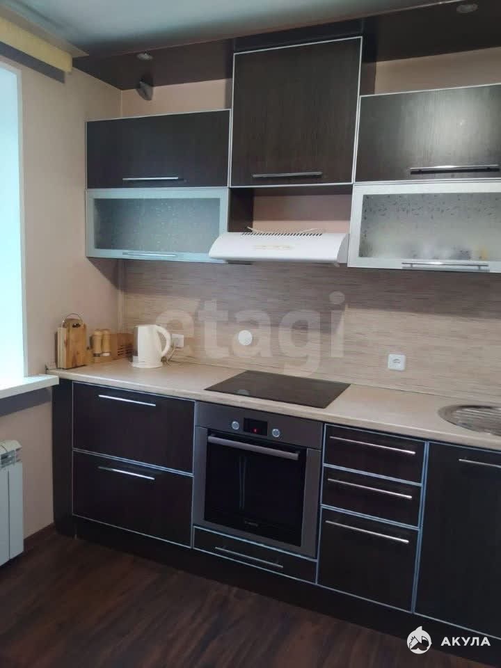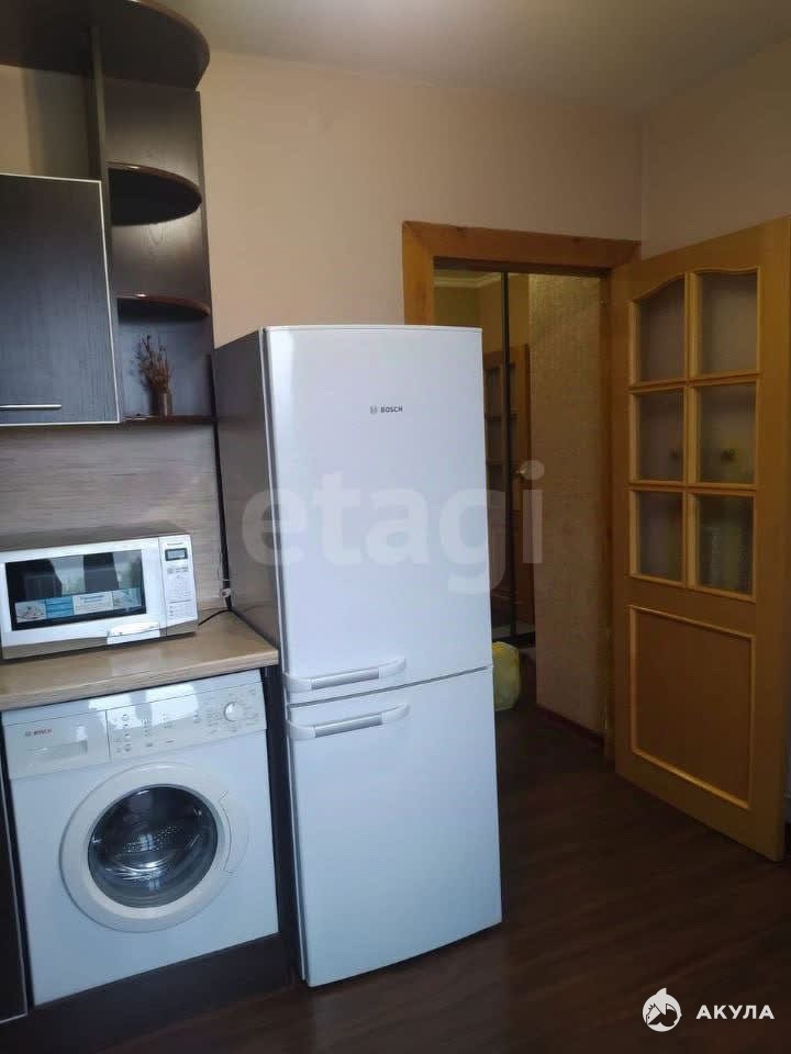В квартире имеется: кухонный гарнитур, стол, стулья, холодильник, микроволновка, диван, шкаф, стиральная машинка, телевизор.