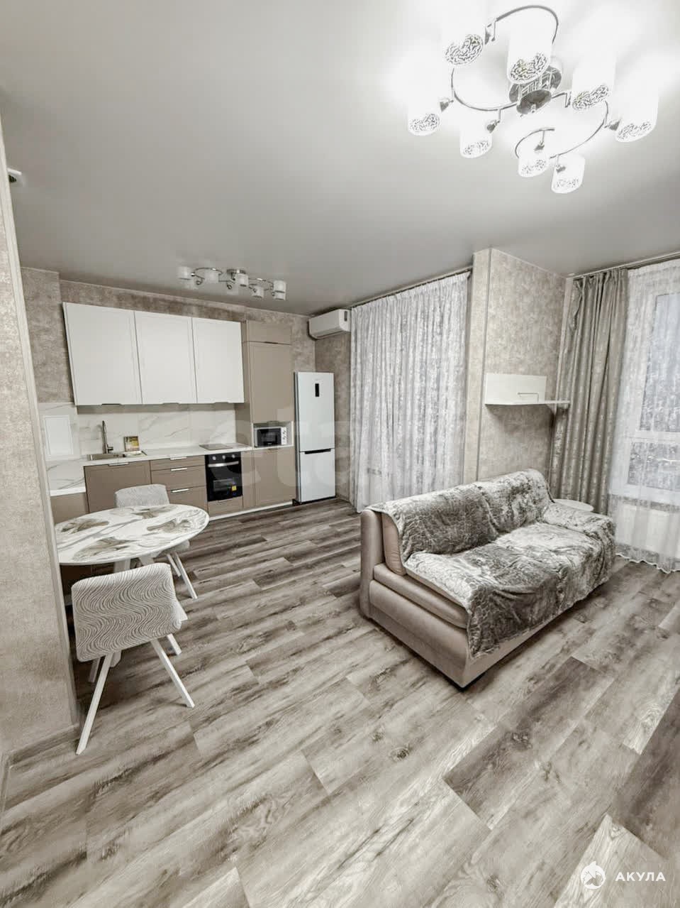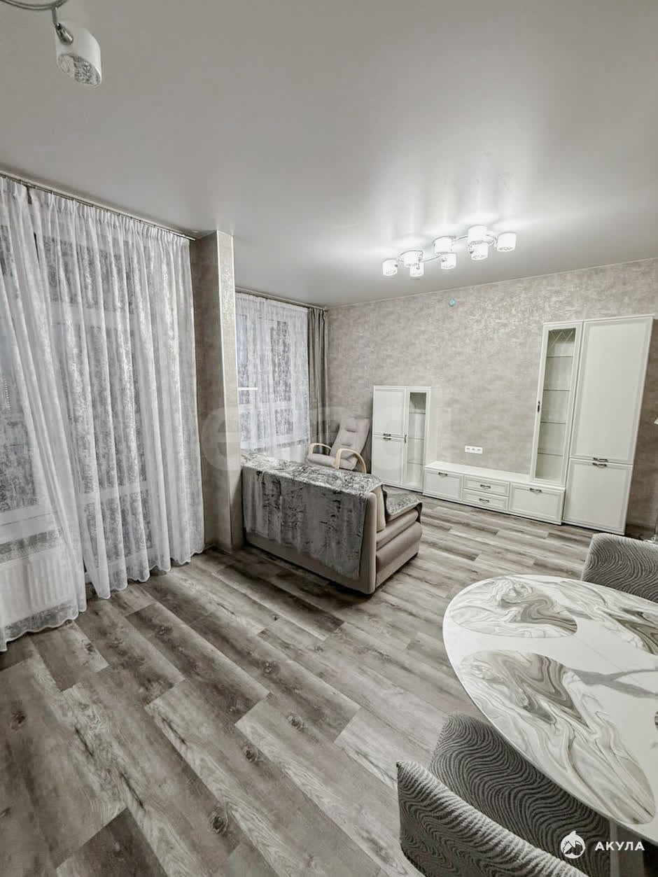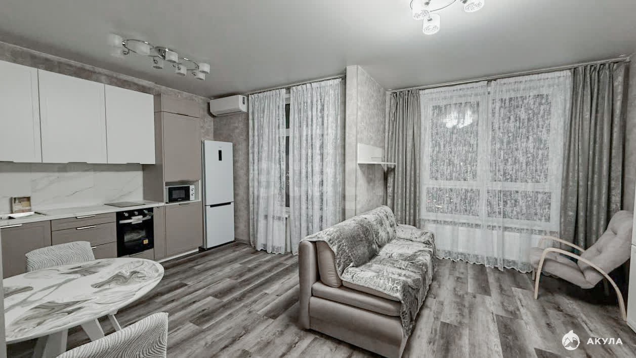 В квартире выполнен дизайнерский ремонт, установлена современная мебель и техника. Просторная комната со смежной планировкой, совмещённый санузел, балкон с видом на улицу и двор. Из бытовой техники есть холодильник, стиральная машина и кондиционер.