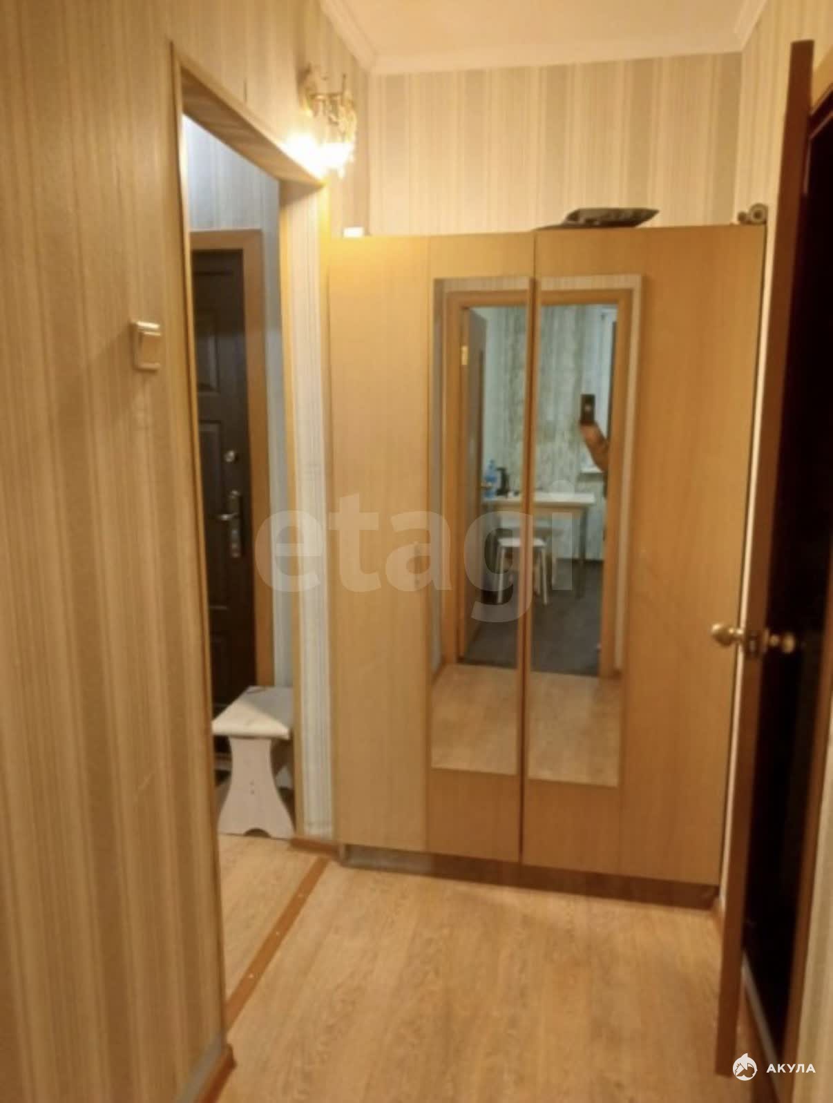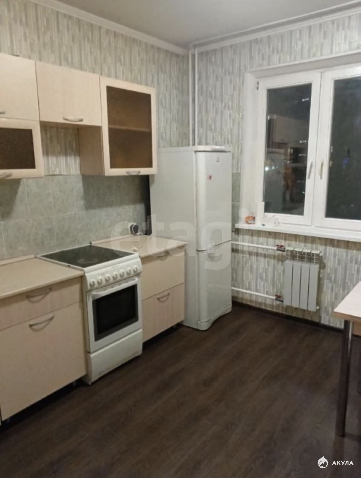 В квартире имеется: кухонный гарнитур, обеденный стол, стулья, холодильник, диван, шкаф, стиральная машинка.