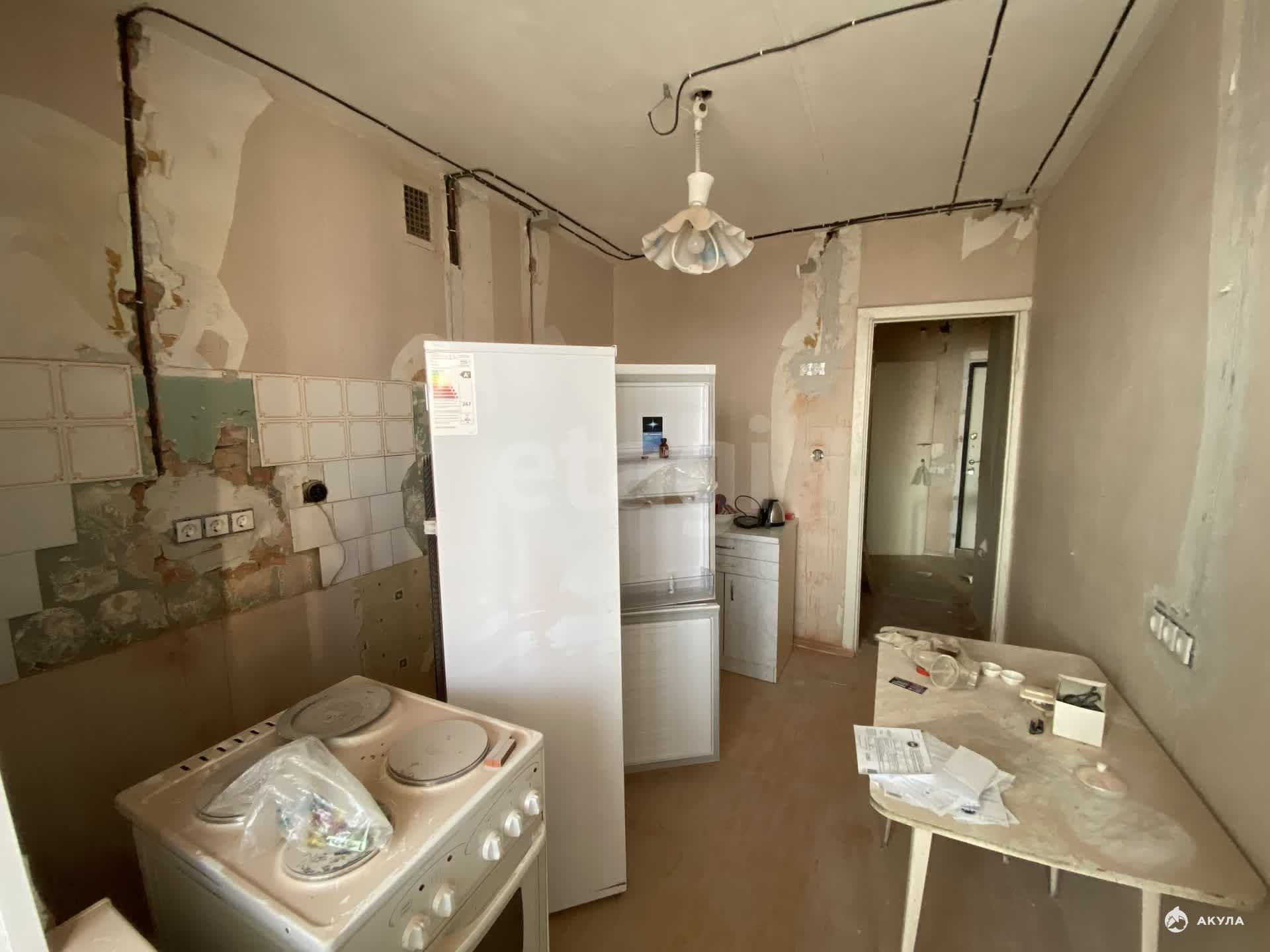 В квартире есть: электрическая плита, холодильник, два стола, табуретки, плательный шкаф.