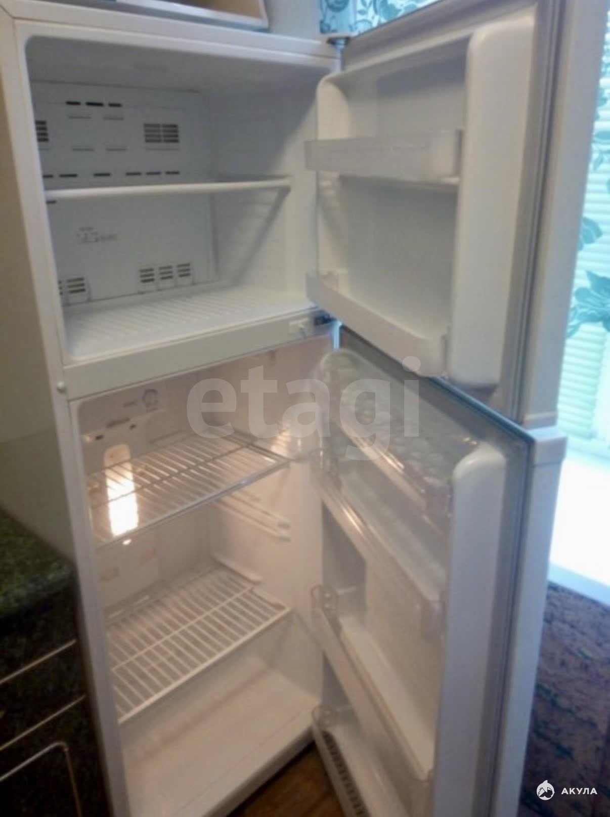 В квартире имеется: кухонный гарнитур, обеденный стол, стулья, холодильник, тумбочка, банкетка, стиральная машинка.