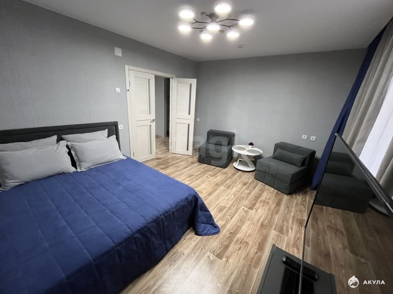 - двуспальная кровать с ортопедическим матрасом, постельное белье и полотенца, два кресла, которые можно использовать, как отдельные спальные места, или соединить в одно большое, шкаф для вещей, ЖК телевизор (есть смарт ТВ).