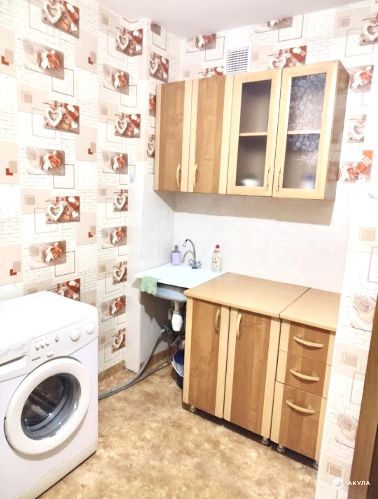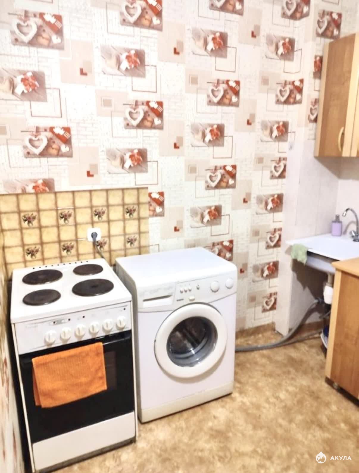 В квартире имеется: кухонный гарнитур, обеденный стол, стулья, холодильник, микроволновка, плита, стиральная машинка, диван, шкаф-стенка.