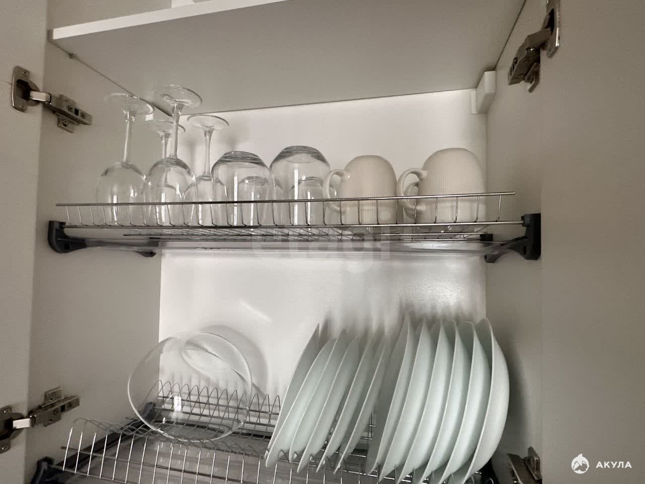 Современная кухня с посудомоечной машиной, микроволновкой, электрическим чайником и полным комплектом посуды.
