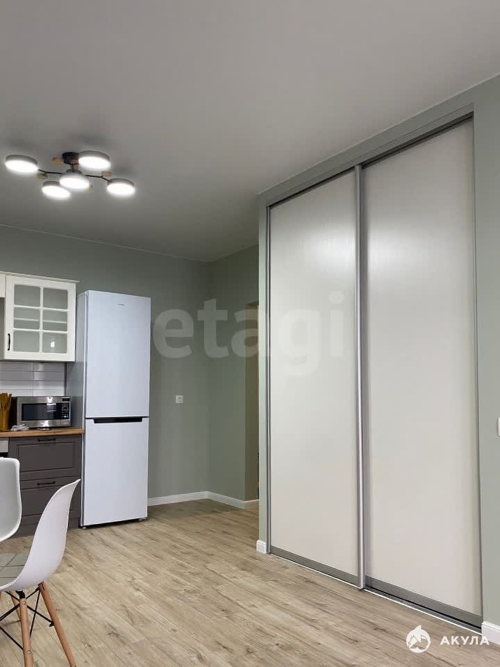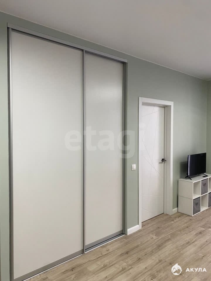 Из мебели и техники есть всё необходимое: холодильник, варочная панель, духовой шкаф, стиральная машина, телевизор, два шкафа-купе и кухонный гарнитур.