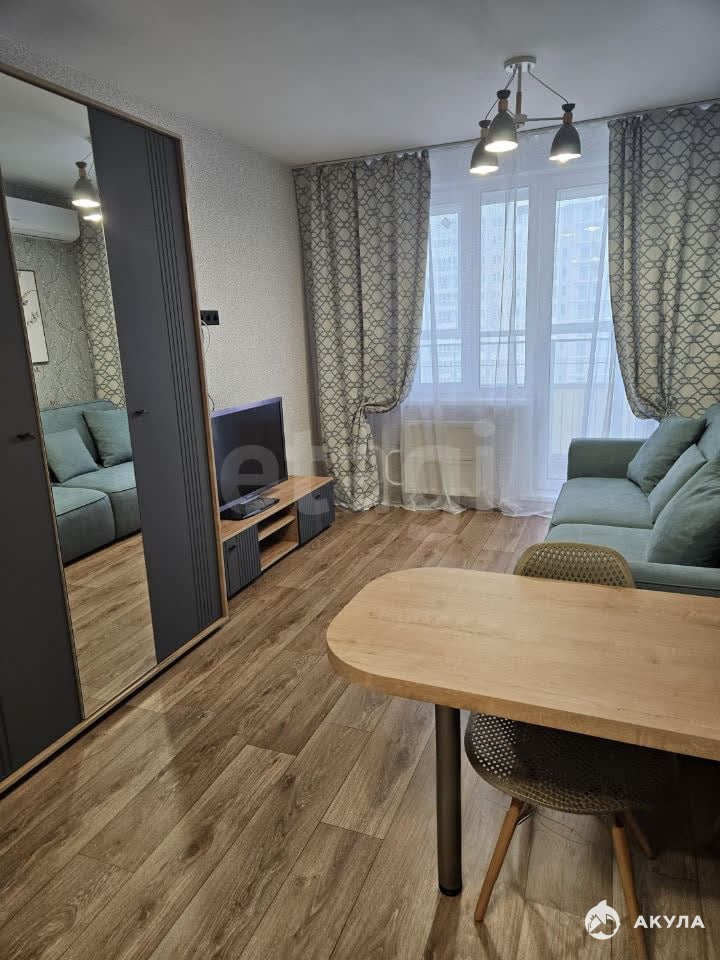 В квартире имеется: кухонный гарнитур, барная стойка, стулья, холодильник, чайник, микроволновка, плита, посудомойка, диван, шкаф, тумба под ТВ, телевизор, кровать, рабочий стол, стиральная машинка.