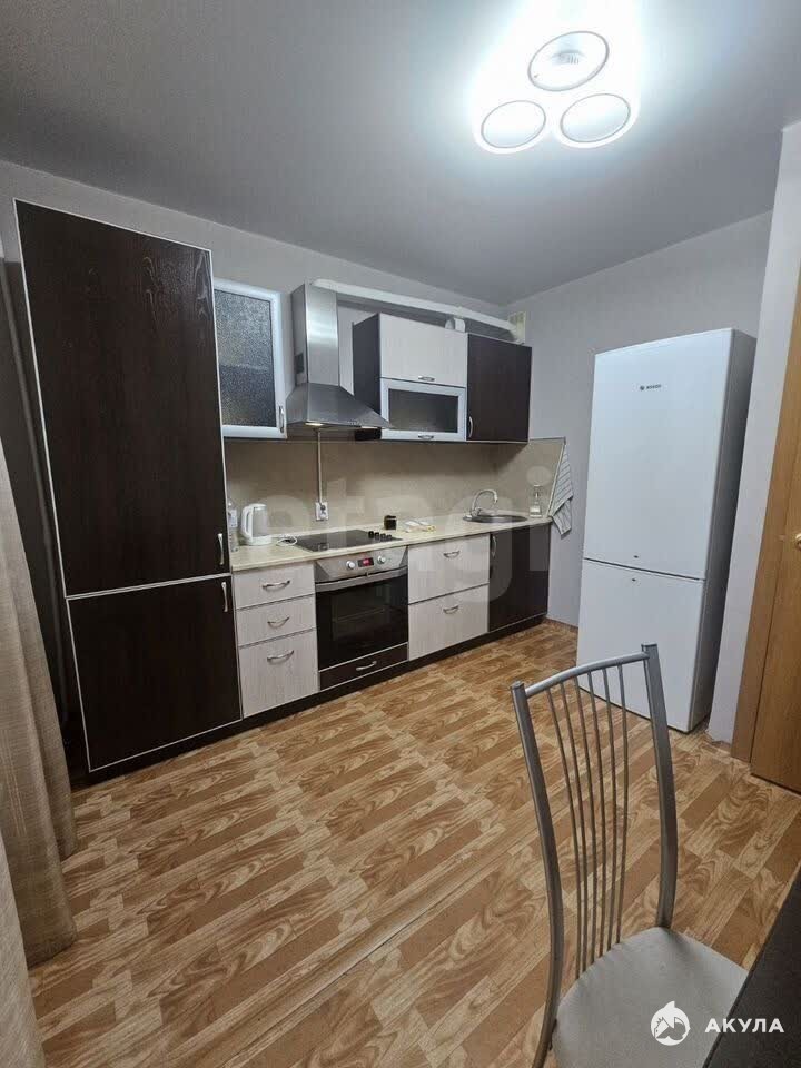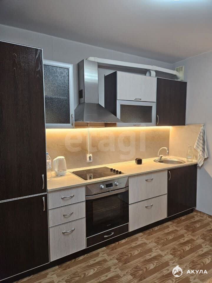 Есть: Кухонный гарнитур, обеденный стол со стульями, электрическая плита, стиральная машина, чайник, вытяжка, кровать, места хранения.