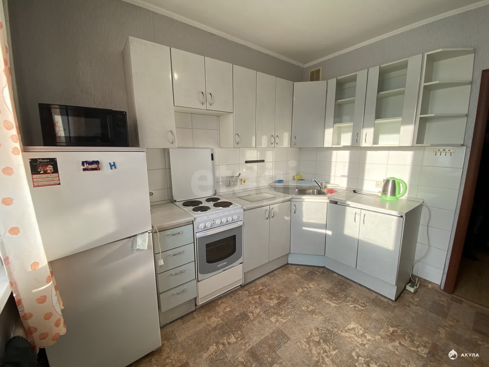 В квартире есть вся необходимая мебель и техника: кухонный гарнитур, электрическая плита, обеденная группа, холодильник, чайник, удобный диван, кровать, стиральная машина, места для хранения.