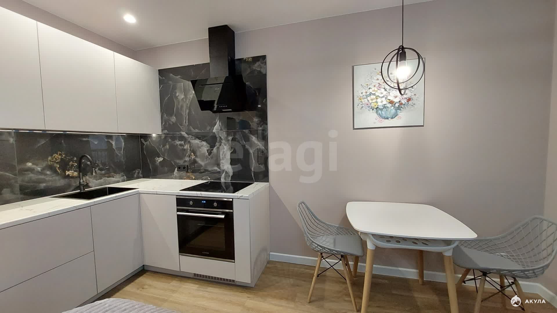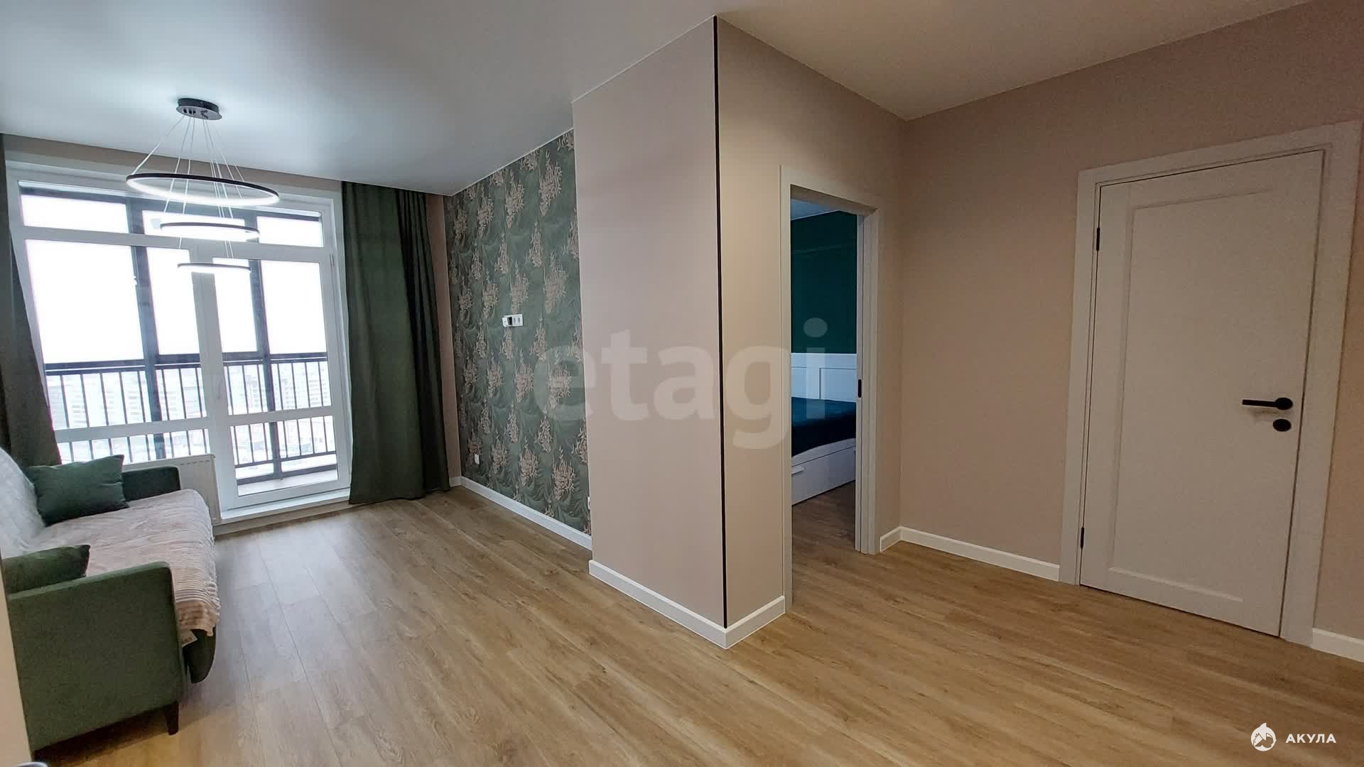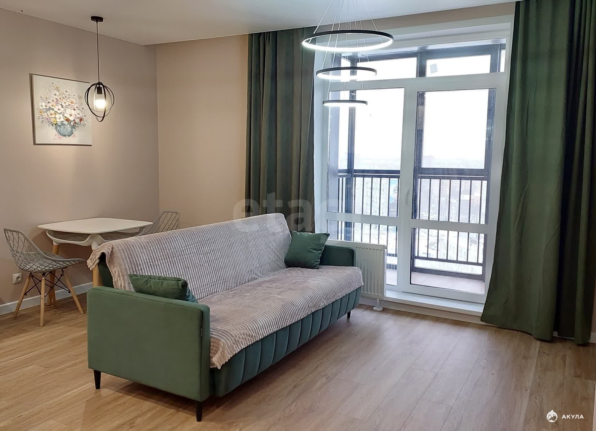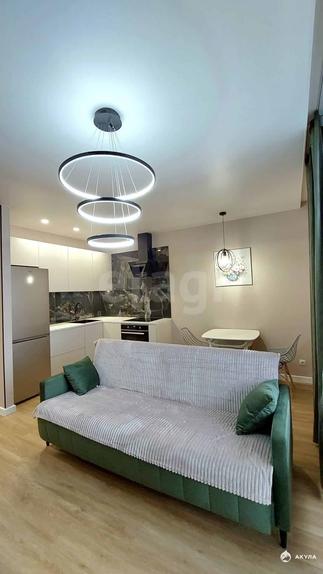 Дом сдался в эксплуатацию полгода назад, а ремонт в квартире только завершился, так что вас ожидает чистое и новое жильё. Ремонт выполнен в спокойных светло-зелёных тонах. На кухне, совмещённой с жилой комнатой, установлен кухонный гарнитур, электрическая плита с духовым шкафом, холодильник, стиральная машинка, обеденный стол со стульями и диван.
