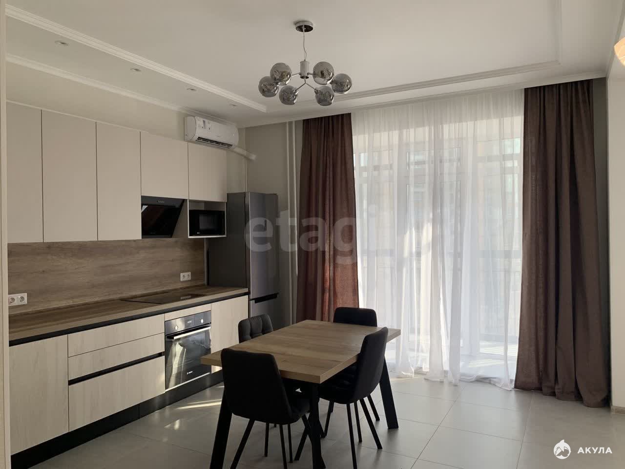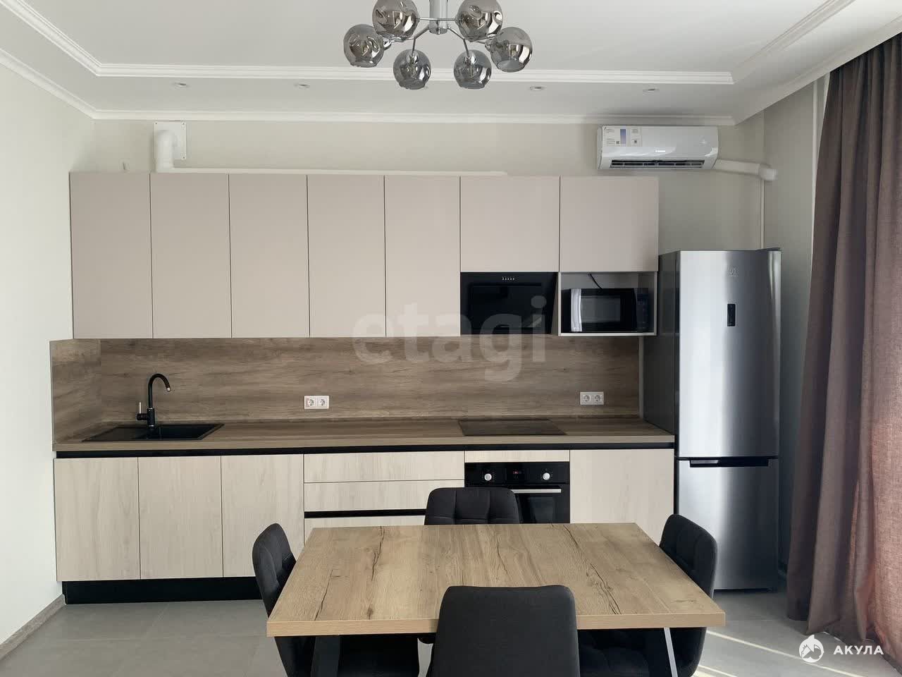 Квартира полностью мебелирована: кухонный гарнитур, стол, стулья, 2 шкафа, диван, кровать