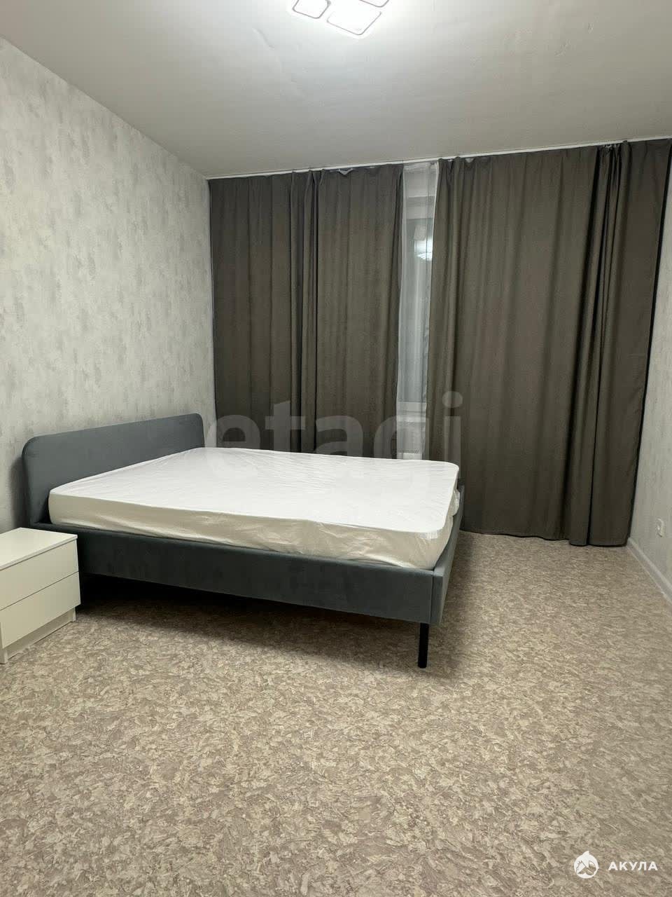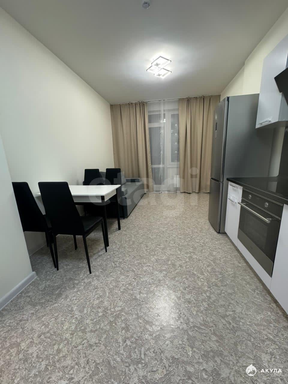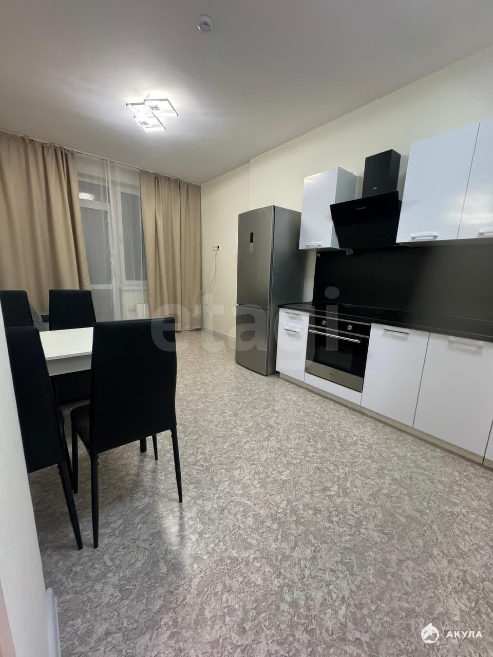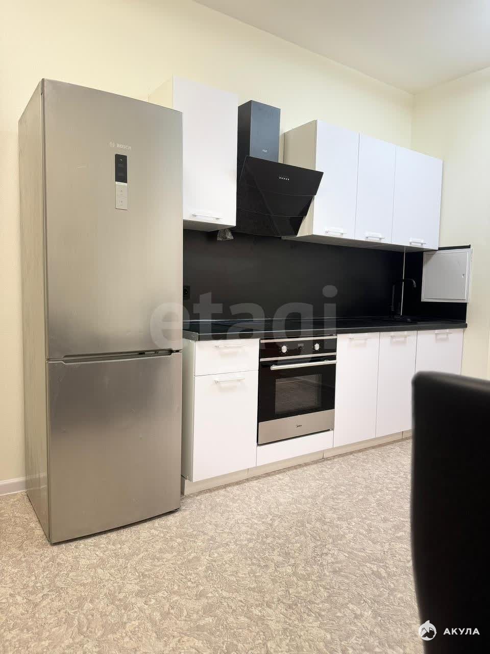 В квартире имеется: кухонный гарнитур, стол, стулья, холодильник, плита, духовка, стиральная машина, диван, кровать, шкаф.