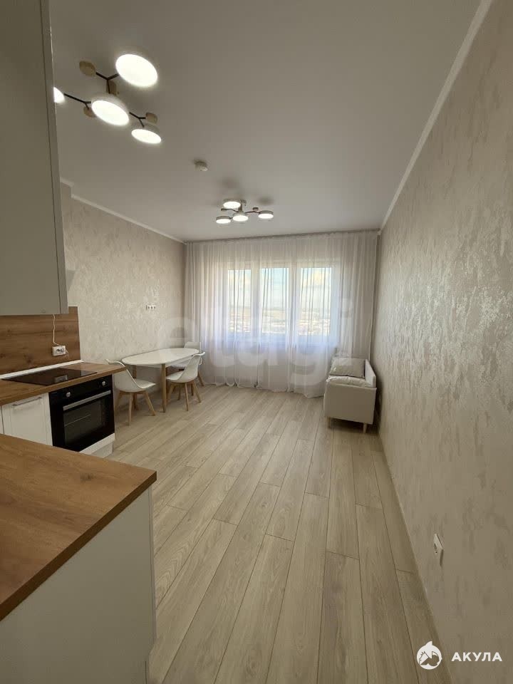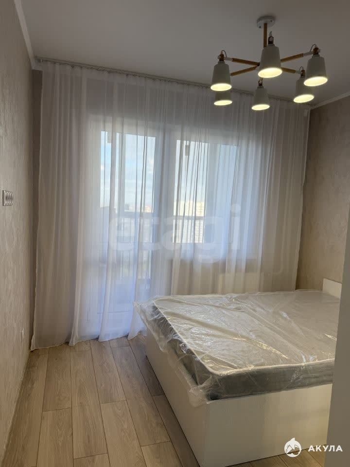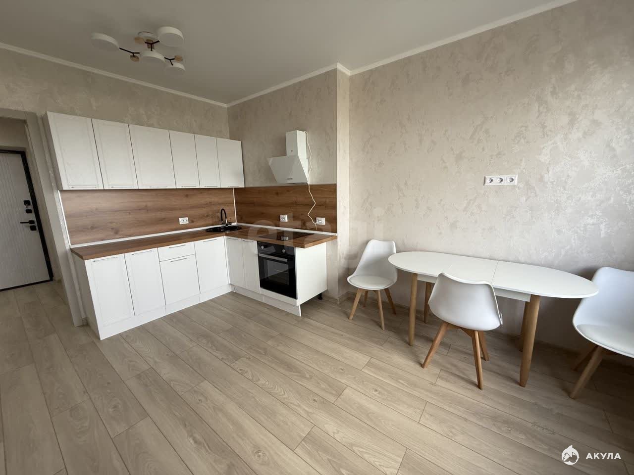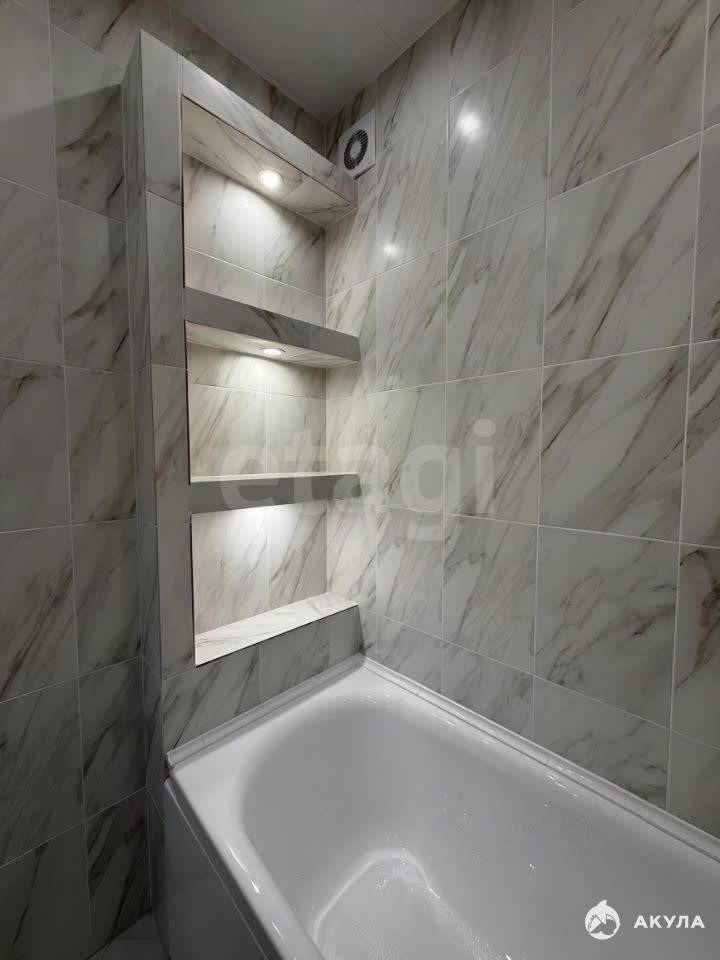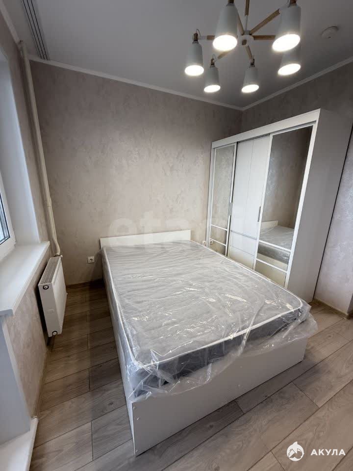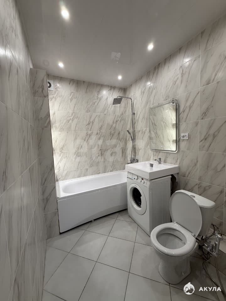 В квартире есть вся необходимая мебель и техника: кухонный гарнитур, варочная поверхность, обеденная группа, холодильник, кровать, стиральная машина, места для хранения. Санузел совмещен, полностью в кафеле.