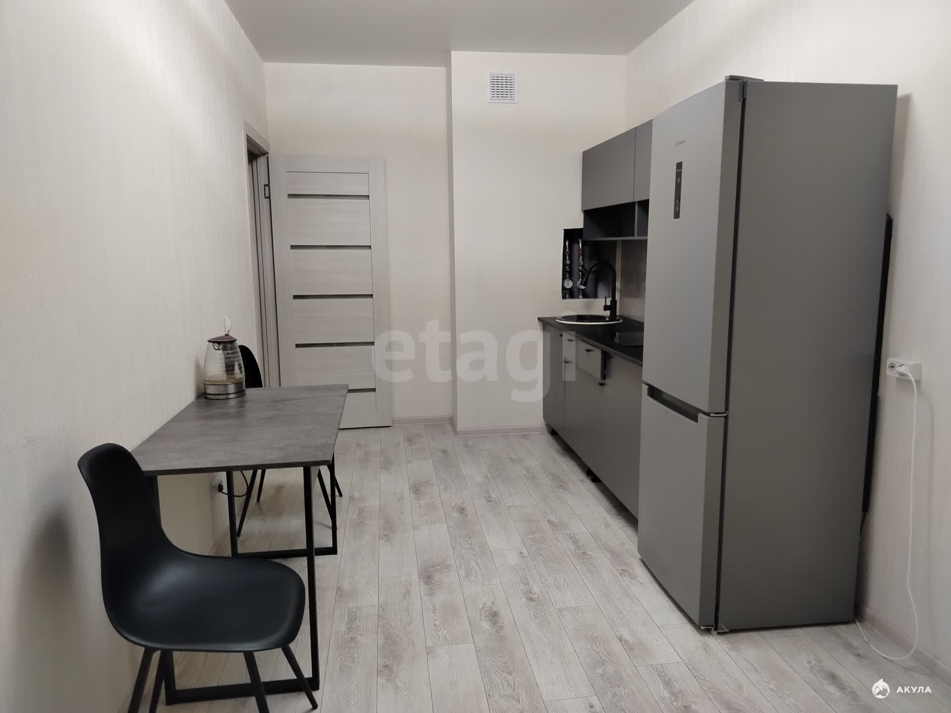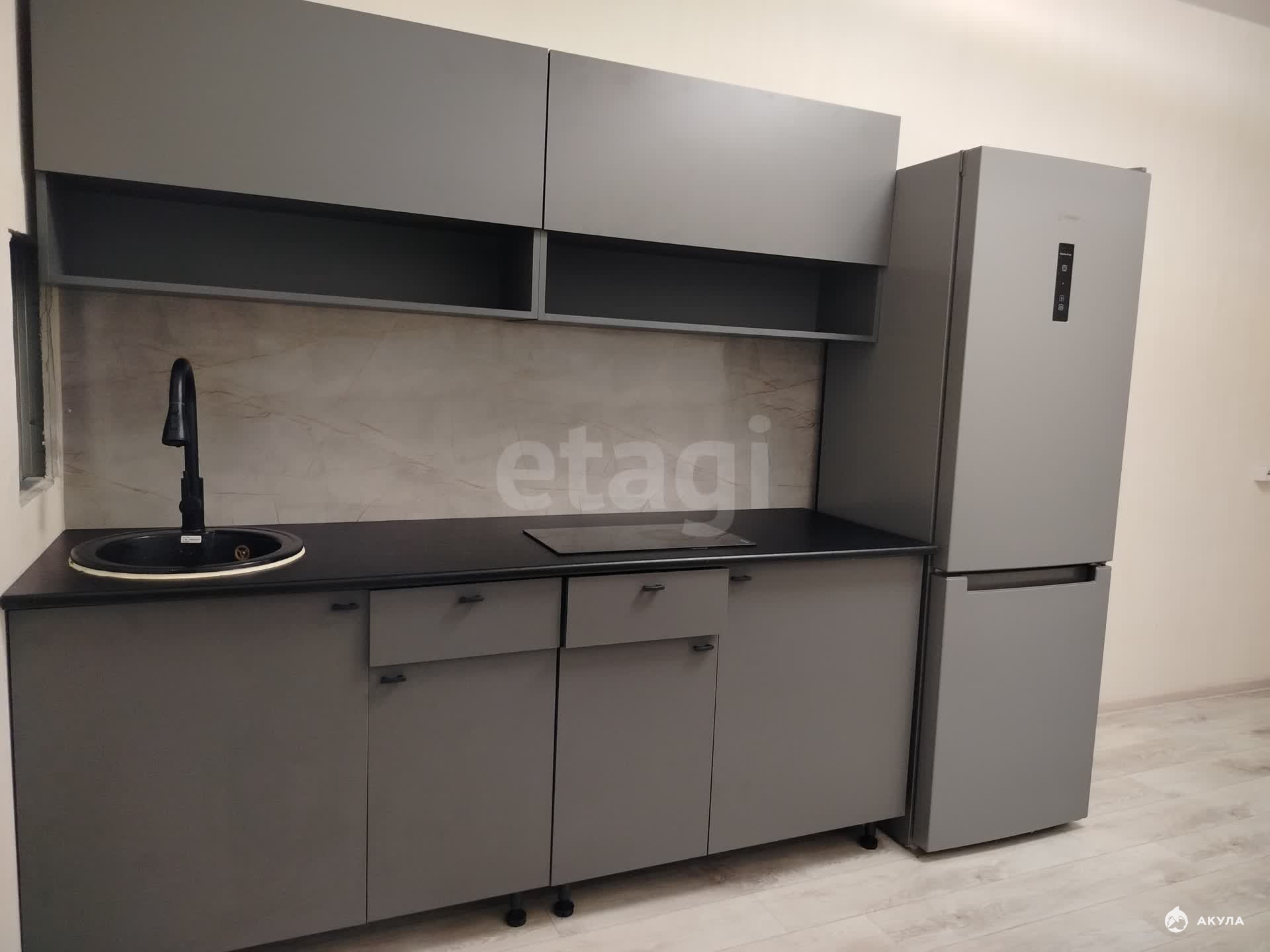 Просторная и уютная кухня оборудована новым кухонным гарнитуром с встроенной новой бытовой техникой: