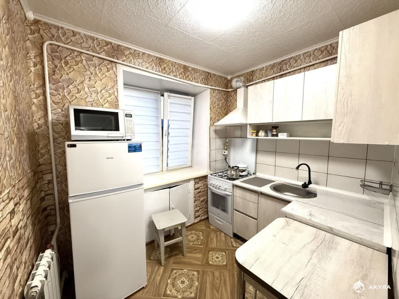 Дом кирпичный. Квартира светлая и тёплая, проведён косметический ремонт. Есть всё необходимое для проживания. Из мебели — 3 кресла, 2 дивана, 1 кровать, шкафы, тумбы, рабочий стол, кухонный гарнитур. Вся техника рабочая и в хорошем состоянии. Есть холодильник, духовка, газовая плита, стиральная машина, микроволновка.