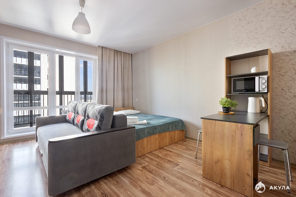 Современная и просторная студия с великолепным видом на реку Енисей. Квартира оборудована новой мебелью и всей необходимой бытовой техникой для комфортного проживания. В кухонной зоне есть плита, микроволновая печь, холодильник и обеденный стол. В студии предусмотрены широкая двуспальная кровать и раскладной диван, что позволяет разместить до 4 человек. Также в квартире проведён Wi-Fi, доступны кабельные каналы, установлена стиральная машина. Из квартиры есть выход на балкон с потрясающим видом с 14 этажа. Дом находится в Центральном районе с развитой инфраструктурой. В 150 метрах расположена Центральная набережная, рядом находятся главные достопримечательности города, парк имени М. Горького, места для отдыха, кафе и супермаркет "Хороший".