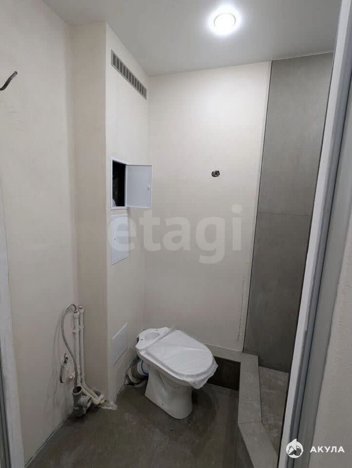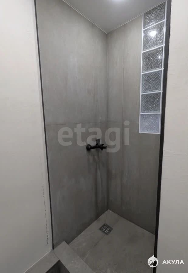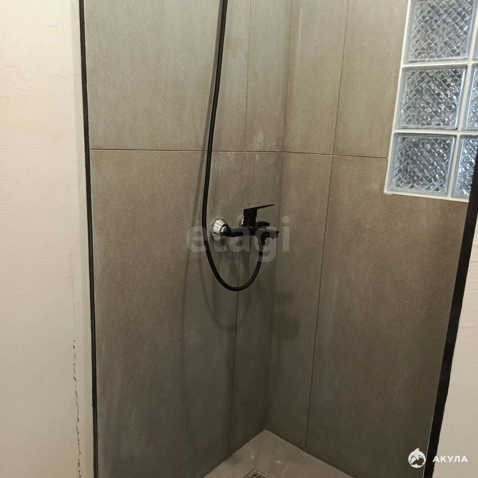 Санузел совмещённый с душевым поддоном и местом для подключения стиральной машинки, оформлен в светлых тонах с качественным керамогранитом. В сан узле предусмотрена принудительная вытяжка. В перегородке из сан узла в комнату установлены стеклоблоки, так что сан узел имеет естественное освещение в дневное время.