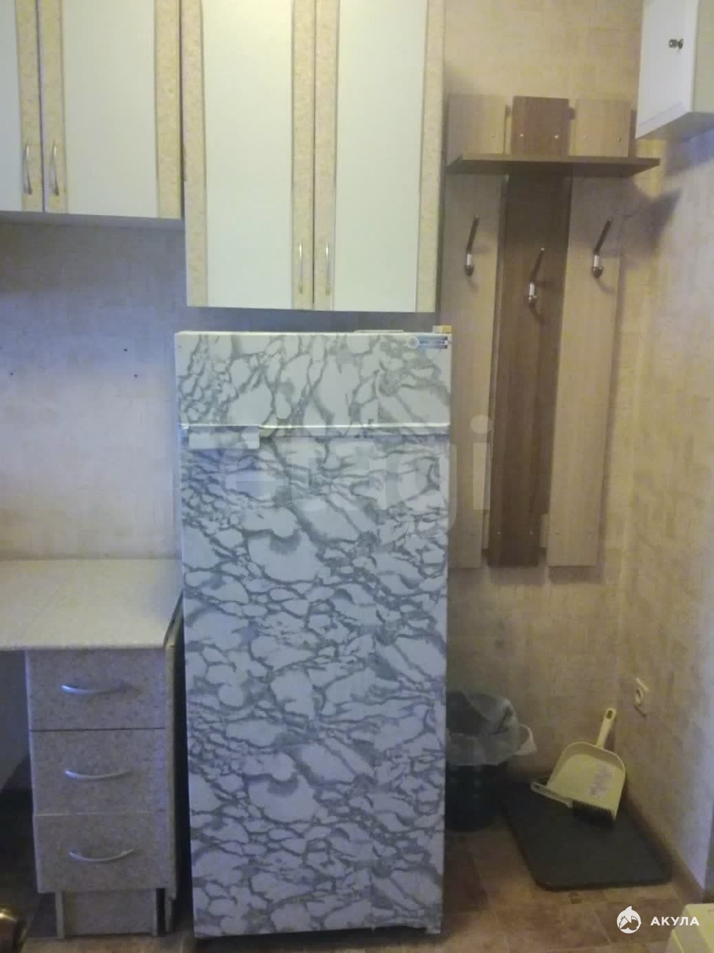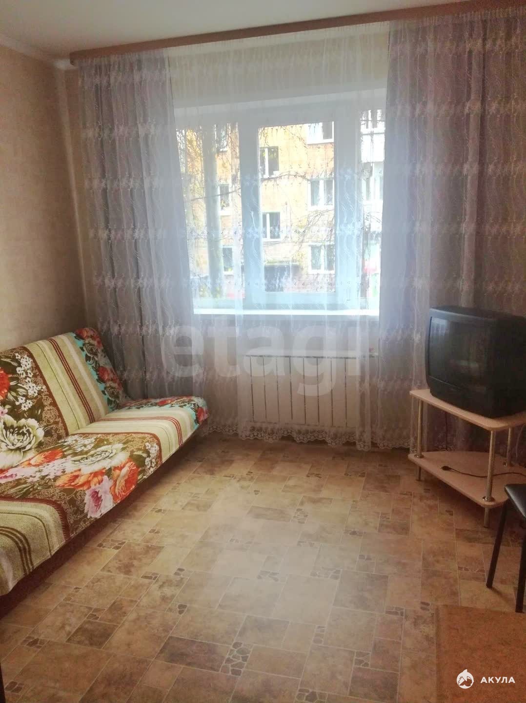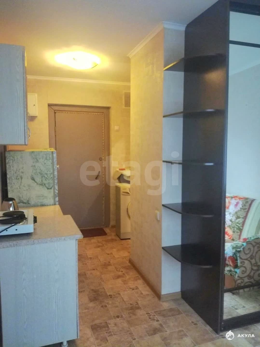 В квартире есть раскладной диван, кухонный гарнитур, двойная конфорка, электрическая плита, холодильник, телевизор старого типа, автоматическая стиральная машинка, совмещённый санузел.